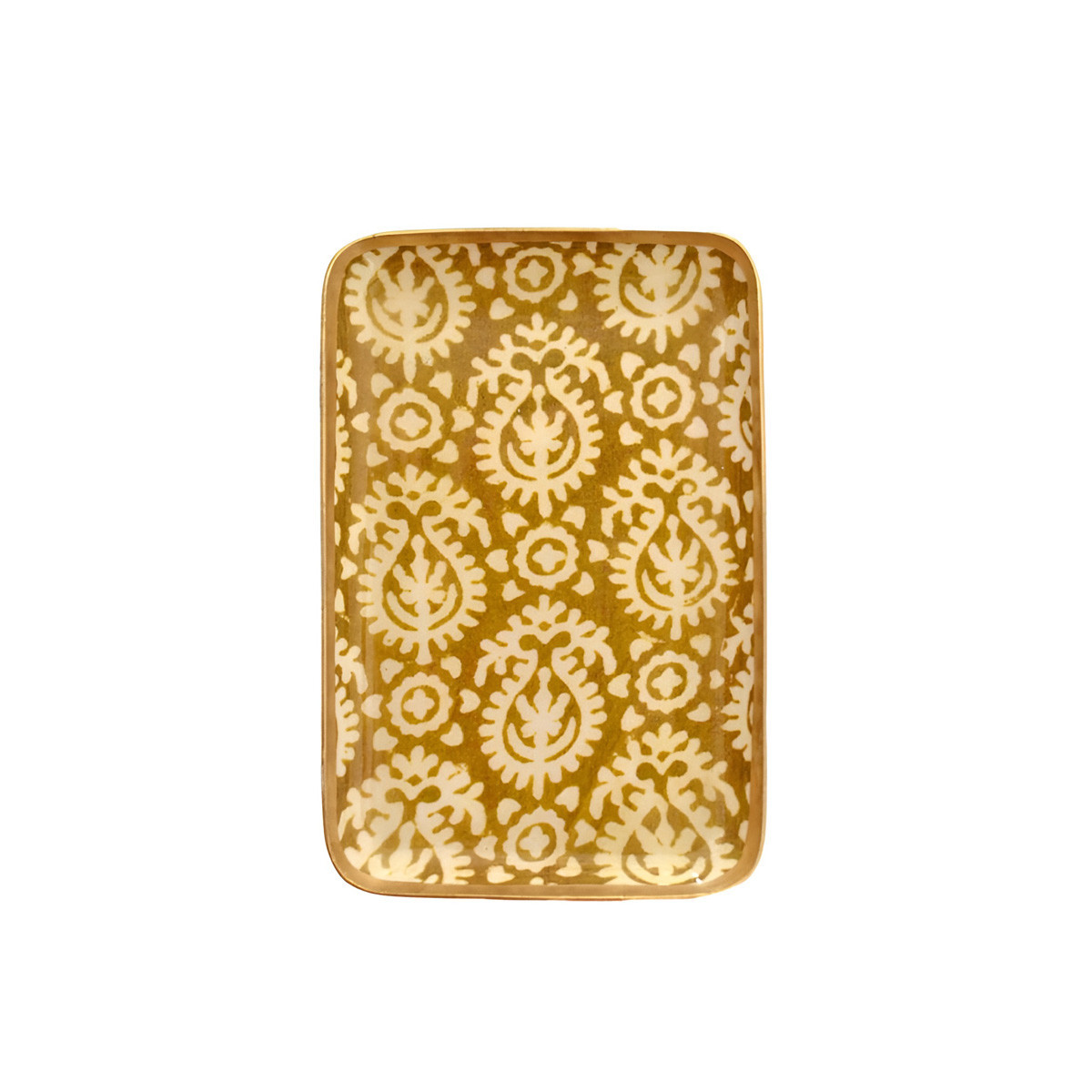 Le plateau se distingue par sa belle couleur ocre, rehaussée d'un motif délicat qui évoque à la fois modernité et nature. Sa bordure dorée, appliquée à la main, apporte une touche de luxe à cet accessoire de table, le rendant idéal pour toutes les occasions.