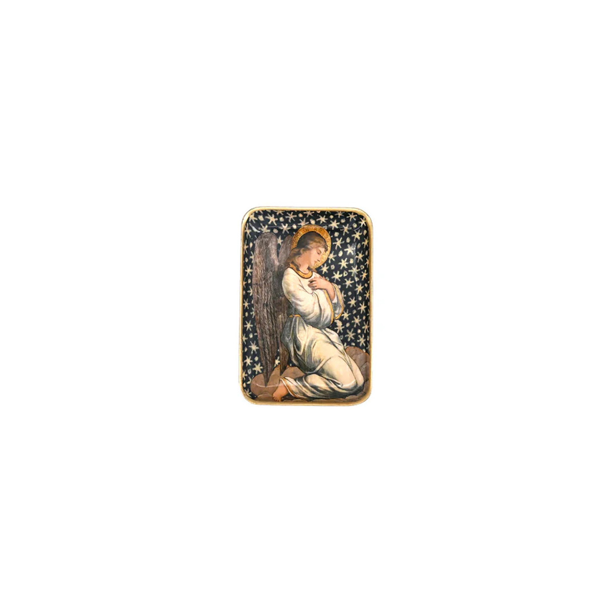 Petit Plateau SOLO ANGE Boncoeurs (15 x 10 cm). Aluminium émaillé couleur Carbone - Ocre. Motif Ange sur fond étoilé. Bordure dorée à la main. Idéal pour service ou vide-poche.