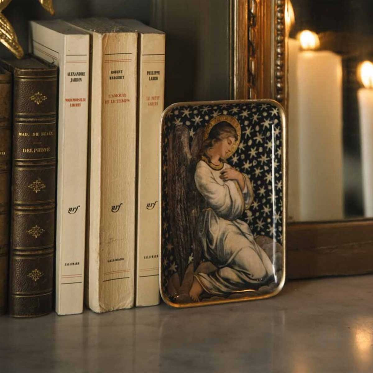 Le petit plateau SOLO ANGE de BONCOEURS est une pièce décorative et pratique, parfaitement adaptée à un usage individuel. Issu de la collection "Les Yeux vers les Cieux", il vous invite à la contemplation grâce à son motif angélique sur un fond étoilé.