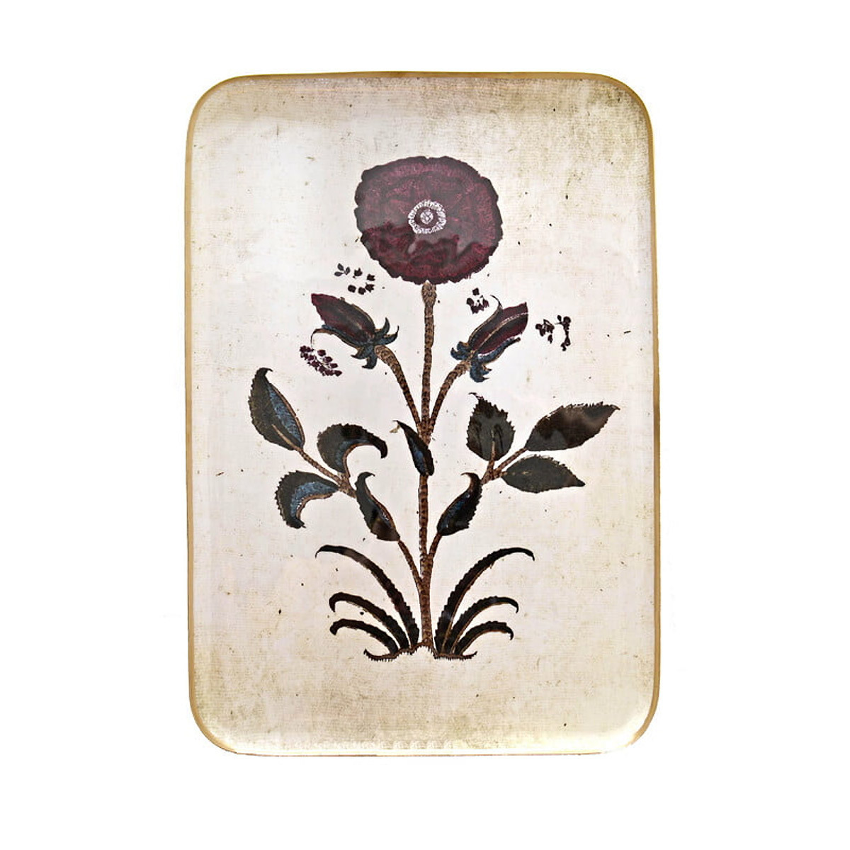 Grand Plateau Rectangulaire RECEPTION Pivoine Boncoeurs. Aluminium émaillé. Motif pivoine sur fond façon papier vieilli. Dimensions : 58 x 40 x 2,8 cm.
