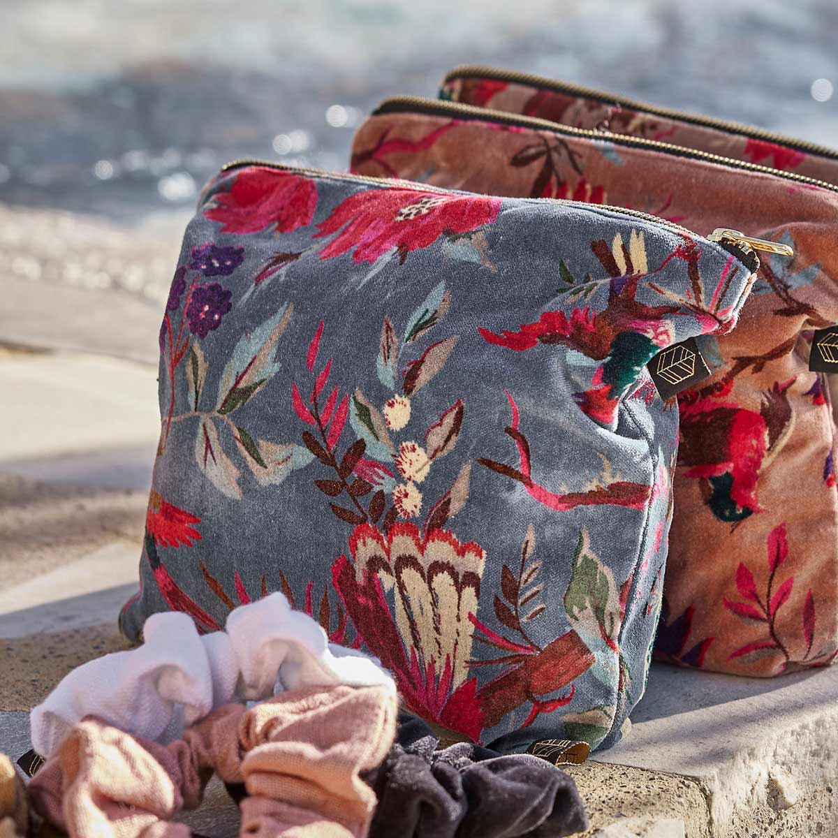 Trousse Birdy Haomy. Velours de coton à l'imprimé oiseaux. Un accessoire poétique et chic pour organiser vos essentiels avec style et délicatesse.