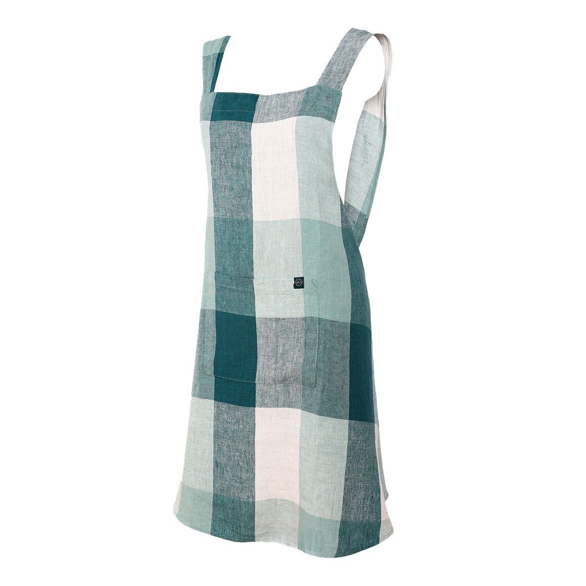 Tablier japonais Tenerife Haomy en lin et coton. Coupe croisée ergonomique, grands carreaux et large poche avant. Style chic et confort pour la cuisine.