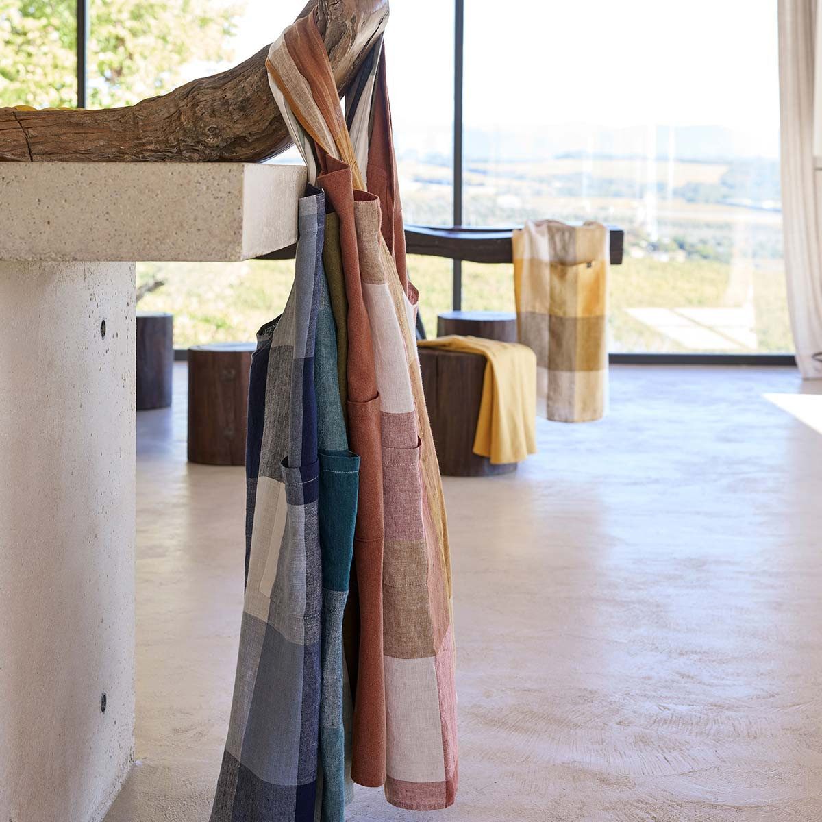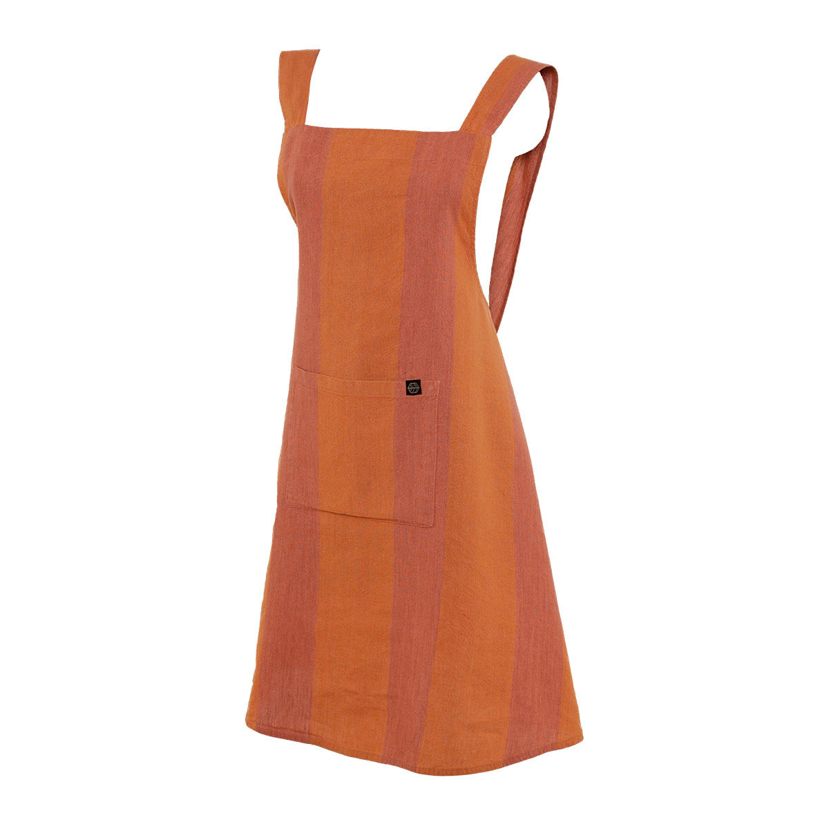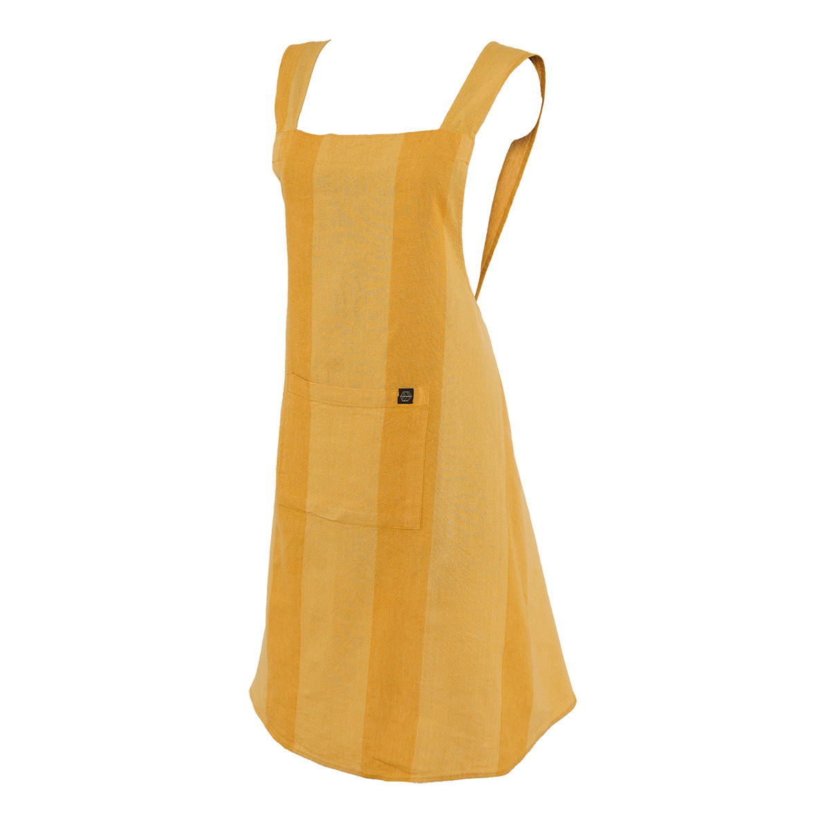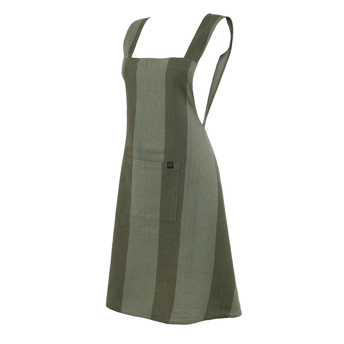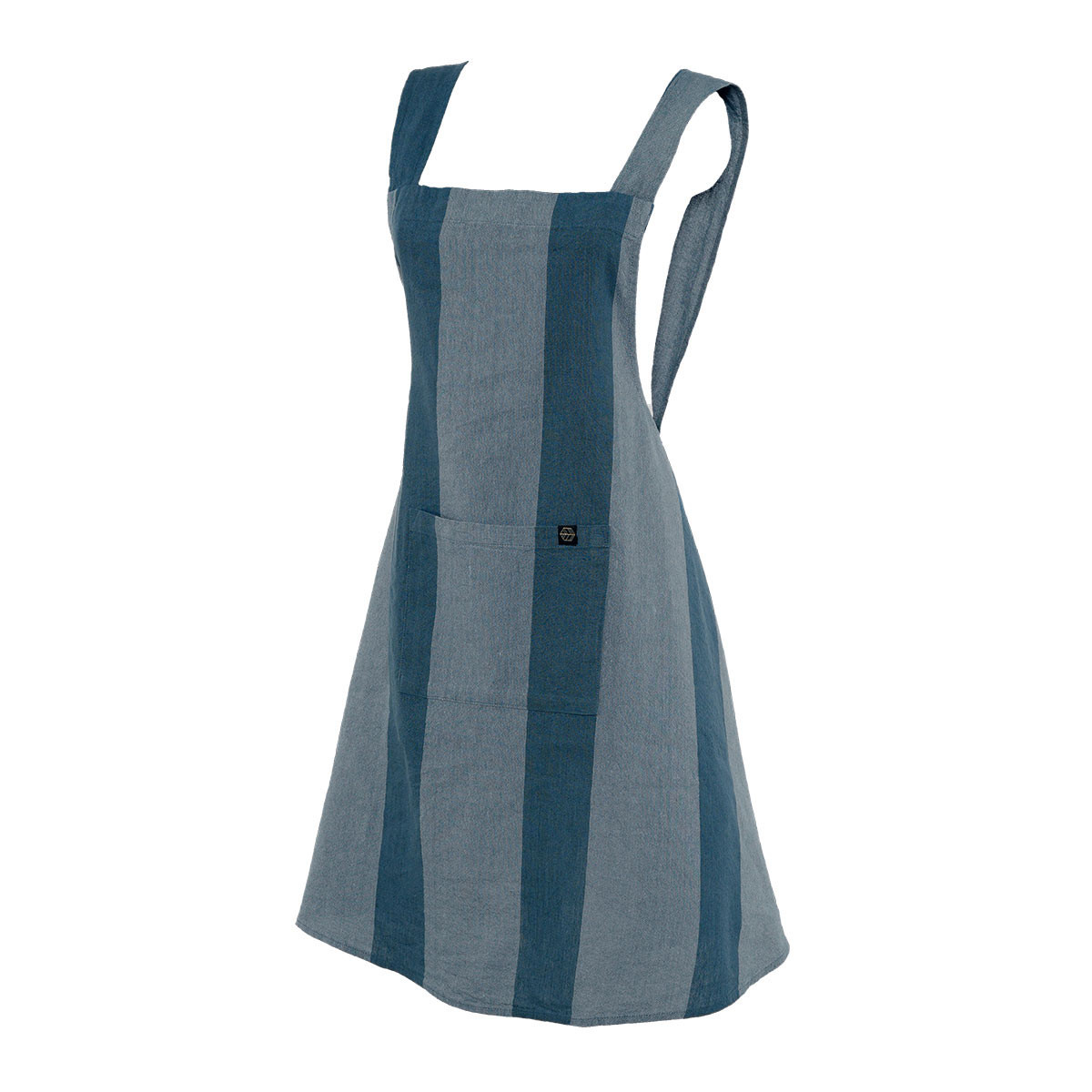 Tablier japonais Santa Cruz Haomy en lin et coton. Coupe croisée sans attaches, larges rayures ton sur ton et grande poche. Style chic et confort en cuisine.