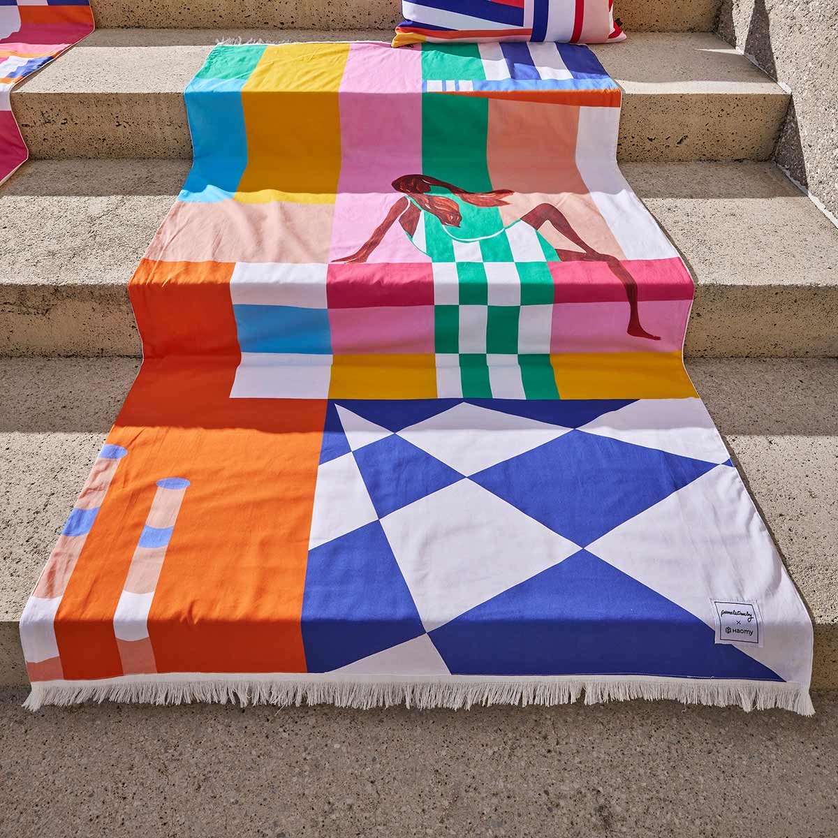 Sa conception astucieuse présente deux faces complémentaires : une face en tissu plat aux couleurs vibrantes pour le style et pour ne pas retenir le sable, et une face en bouclette éponge pour vous sécher tout en douceur après la baignade. Les finitions à franges délicates ajoutent une touche bohème chic, idéale pour vos journées au bord de l'eau ou vos moments de détente au spa.