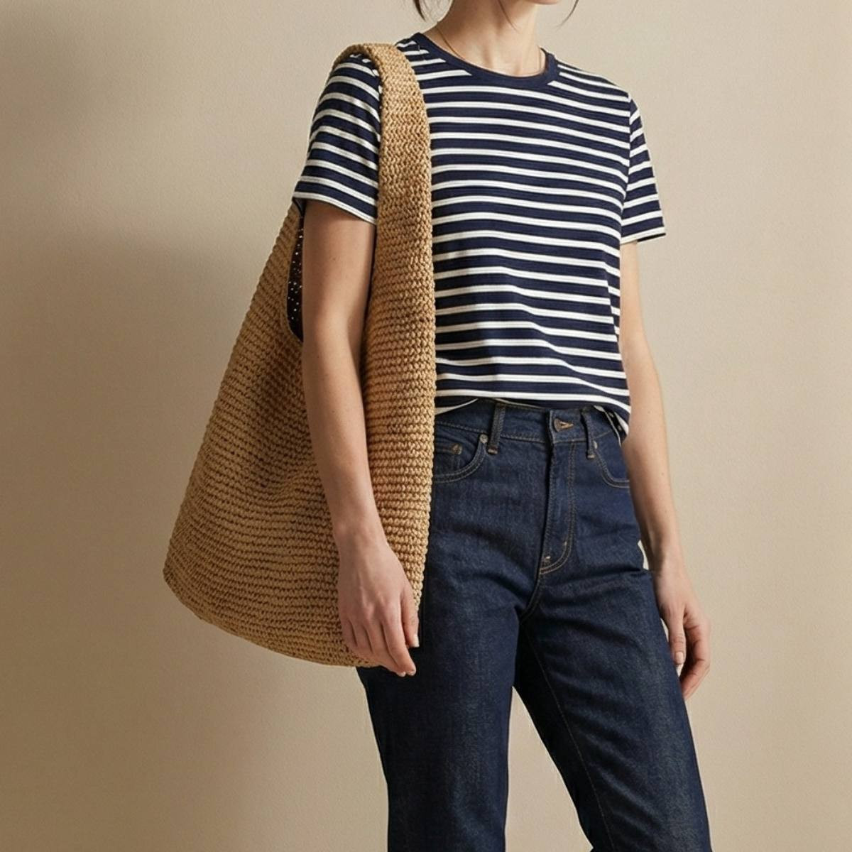 Associations : Avec une robe fluide imprimée florale ou tropicale pour l'accord estival le plus naturel. Avec un jean brut et un top blanc ou écru pour un look casual immédiat. Avec une tenue en lin naturel ou sable pour un accord matière tout-neutre. Avec un ensemble coloré en laissant le beige raphia jouer le rôle du neutre naturel. Avec des sandales en cuir naturel ou camel pour une cohérence matière estivale.