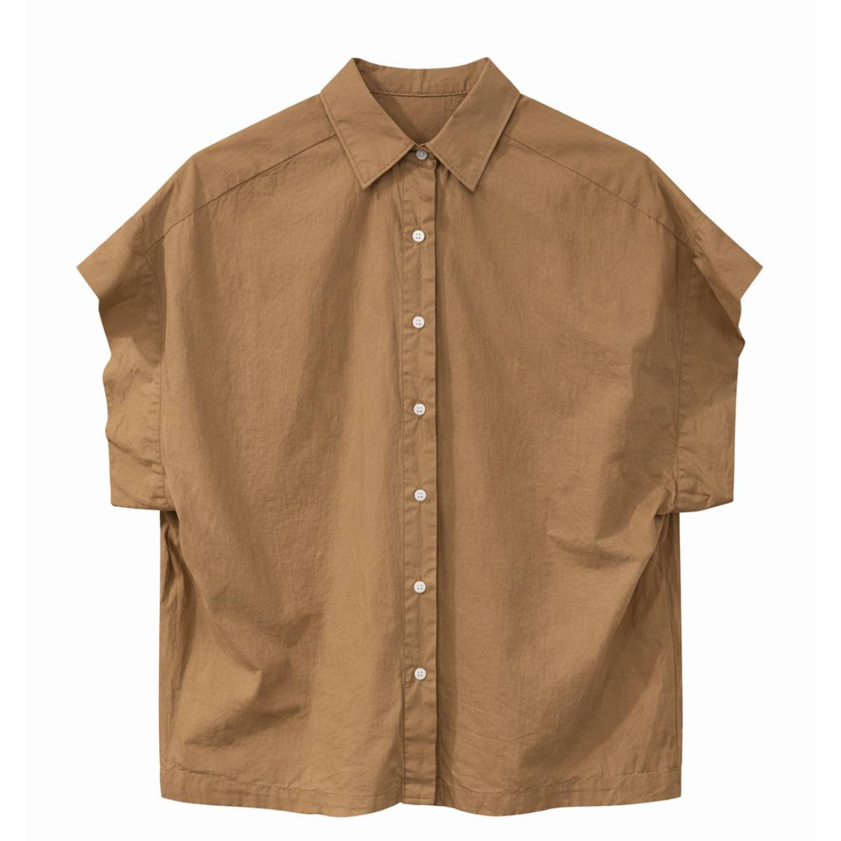 La construction de la CARLOS est précise et soignée. Le col chemisier classique est net et bien dessiné — il structure la façade avec élégance sans rigidité excessive. La fermeture boutonnée sur le devant permet de la porter entièrement boutonnée pour une silhouette chemisier construite, ou ouverte sur un top pour une allure plus libre. Les manches courtes larges sont l'un des détails les plus distinctifs de la CARLOS : leur ampleur et leur tombé évoquent l'esprit d'une petite manche kimono ou tombante, créant un volume expressif et moderne à l'épaule qui tranche avec les manches courtes classiques. Les épaules descendues renforcent cet effet loose et donnent à la silhouette une allure naturellement décontractée et contemporaine.