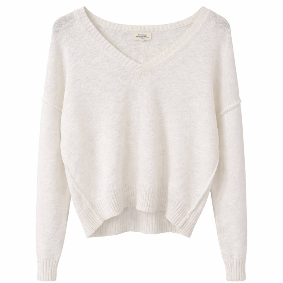 Avec son coton flammé 100% ajouré léger et aéré, son col V large féminin, ses épaules tombantes, son corps blousant structuré par un bord-côte et sa longueur courte moderne, le pull MIRISA de Hartford est une pièce casual chic d'été — en écru pour laisser toute la richesse du coton flammé irrégulier s'exprimer.