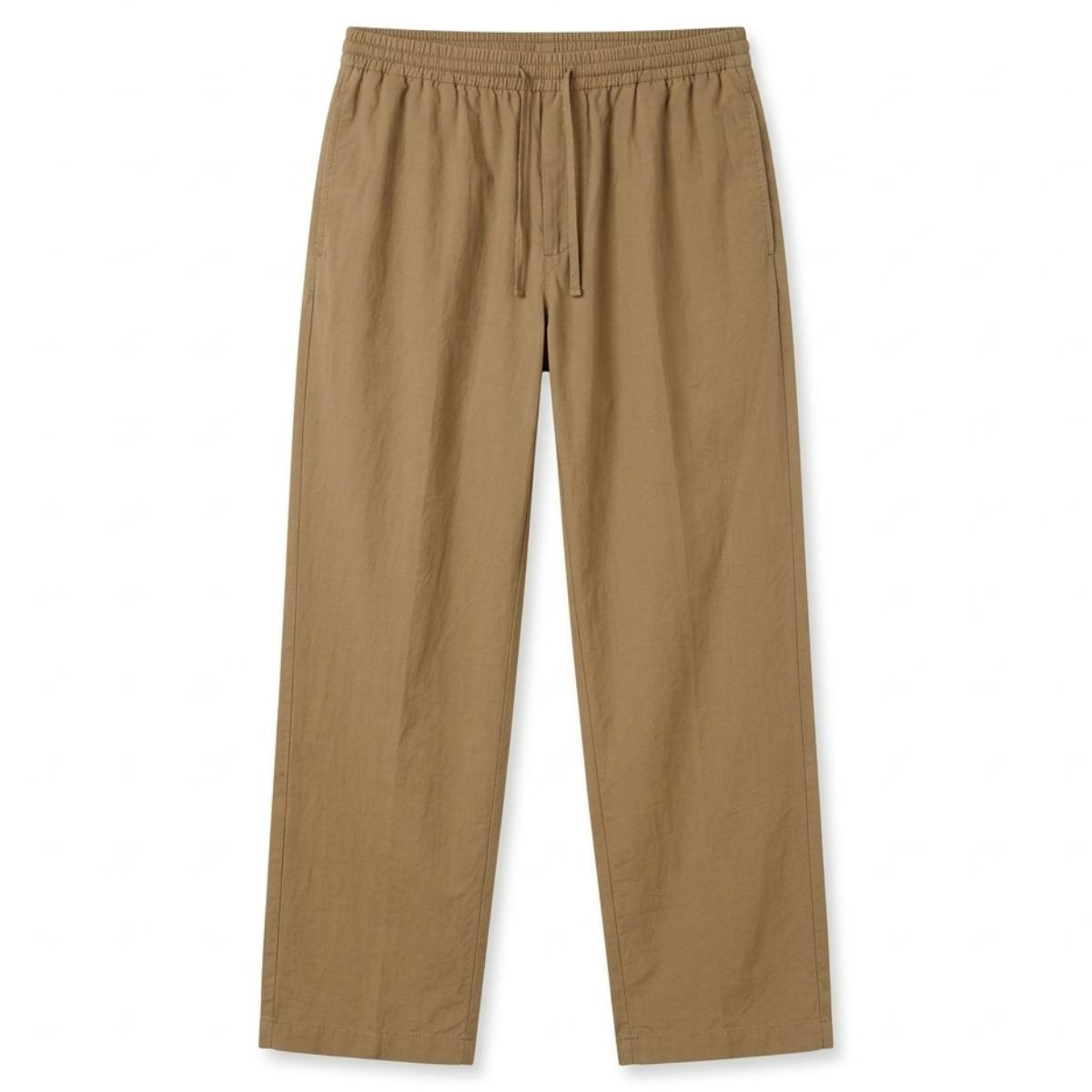 La construction du PEYO est sobre et fonctionnelle. La taille élastiquée assure un confort de port immédiat et constant tout au long de la journée. Le lien de serrage ton sur ton à la taille est discret et élégant — en reprenant la teinte fauve du pantalon, il s'intègre dans la ligne sans attirer l'œil et permet d'ajuster le tombé selon les préférences. Les poches latérales côtés sont discrètes et fonctionnelles, intégrées dans la couture sans déformer la ligne épurée du pantalon. La jambe est droite et régulière, avec un bas simple et droit, sans fente ni ourlet travaillé — une ligne globale nette qui donne au PEYO sa silhouette plus structurée par rapport aux pantalons larges et fluides de la collection.