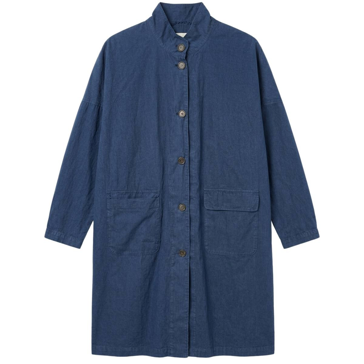 Veste longue en coton de Hartford. 74% coton 26% polyamide, col montant court, grandes poches plaquées, épaules tombantes, coupe droite ample. Coloris night, tailles 2 et 3. Une veste minimaliste et élégante, casual chic au quotidien.