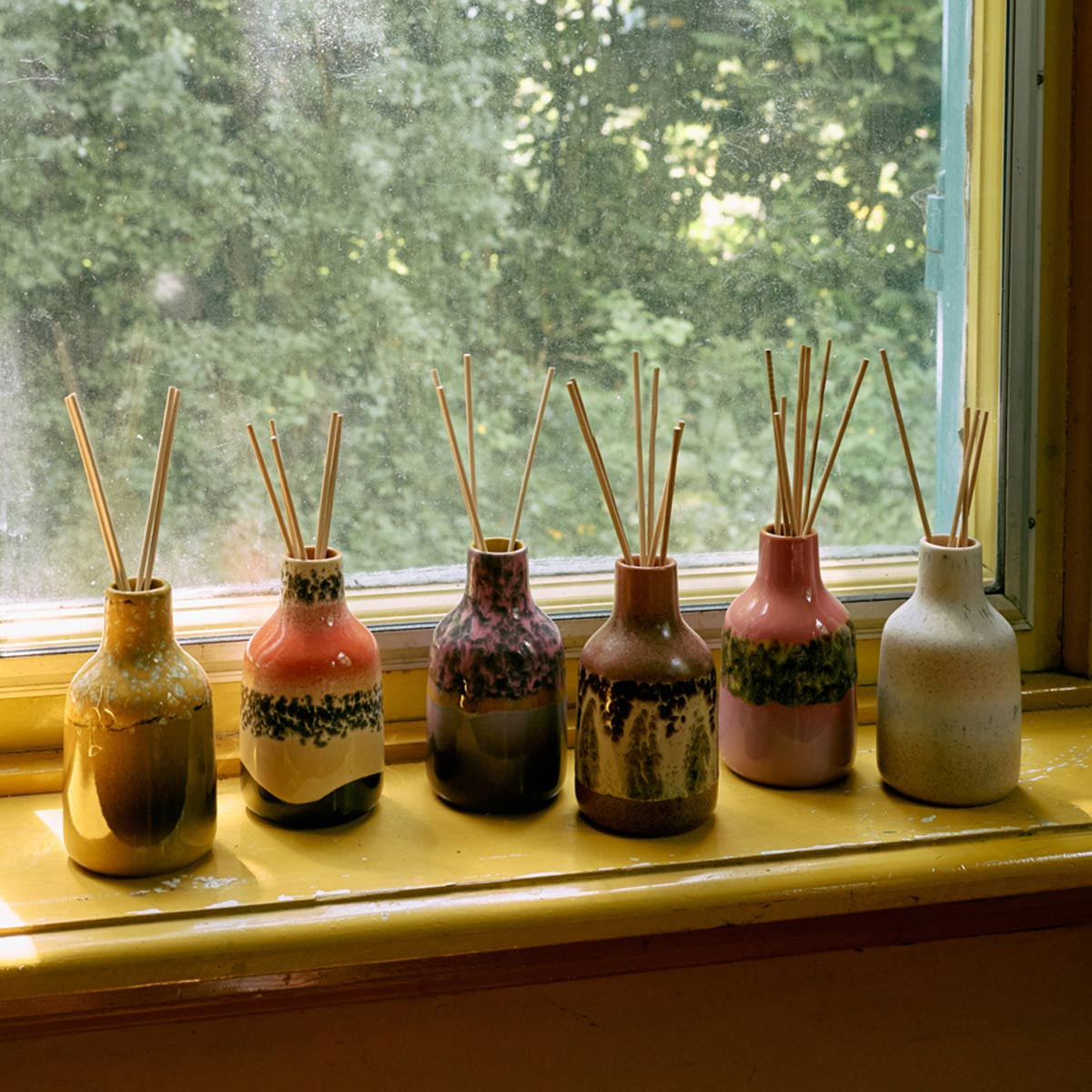 Diffuseur à Bâtonnets Parfum Cape Town HK Living (200 ml). Vase en Céramique 70s Multicolore. Notes de rose, bois de santal, cèdre et baume.