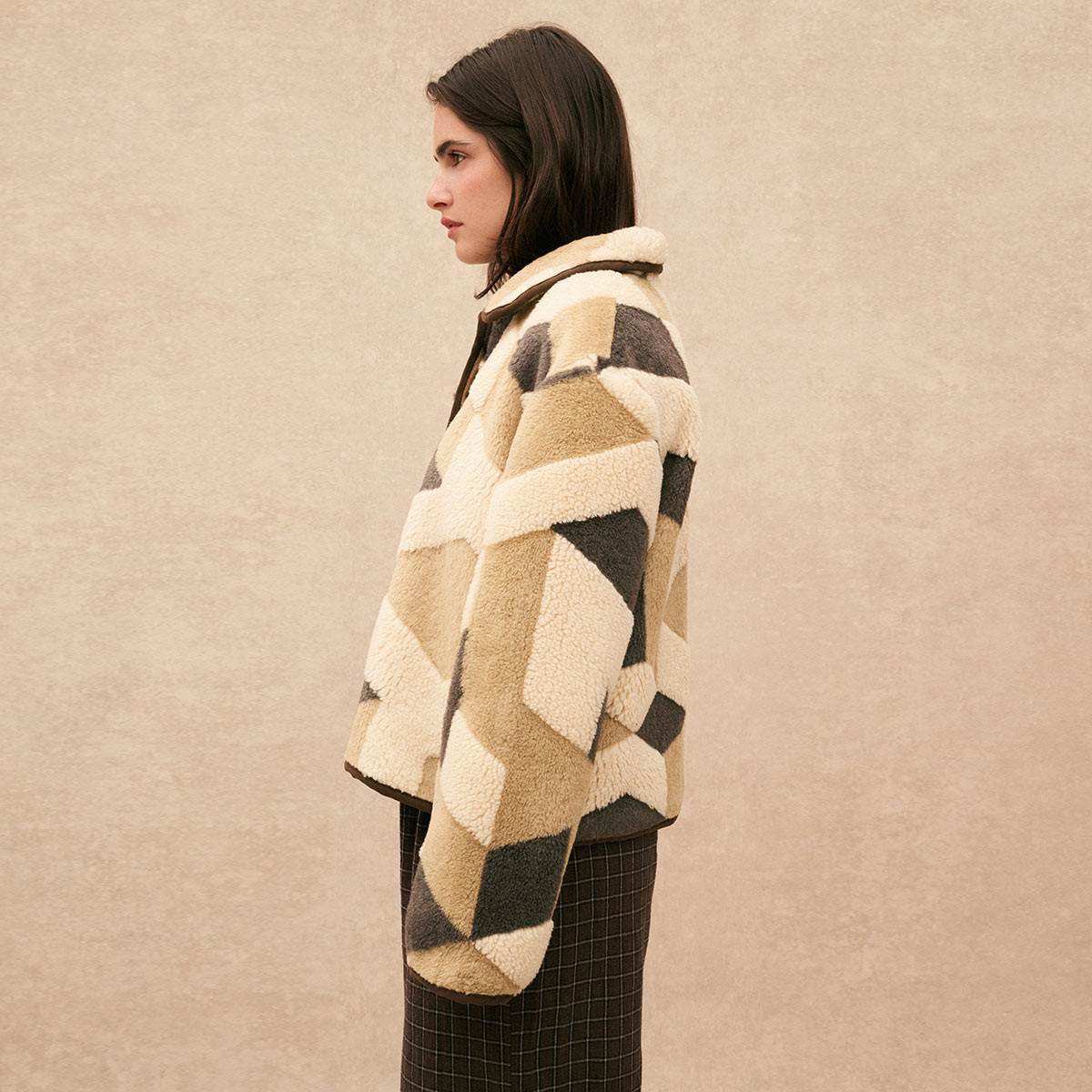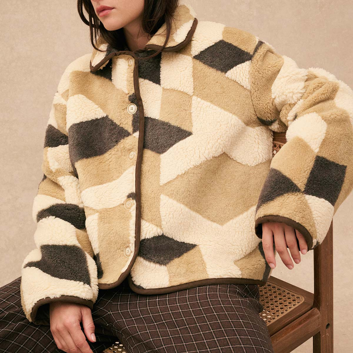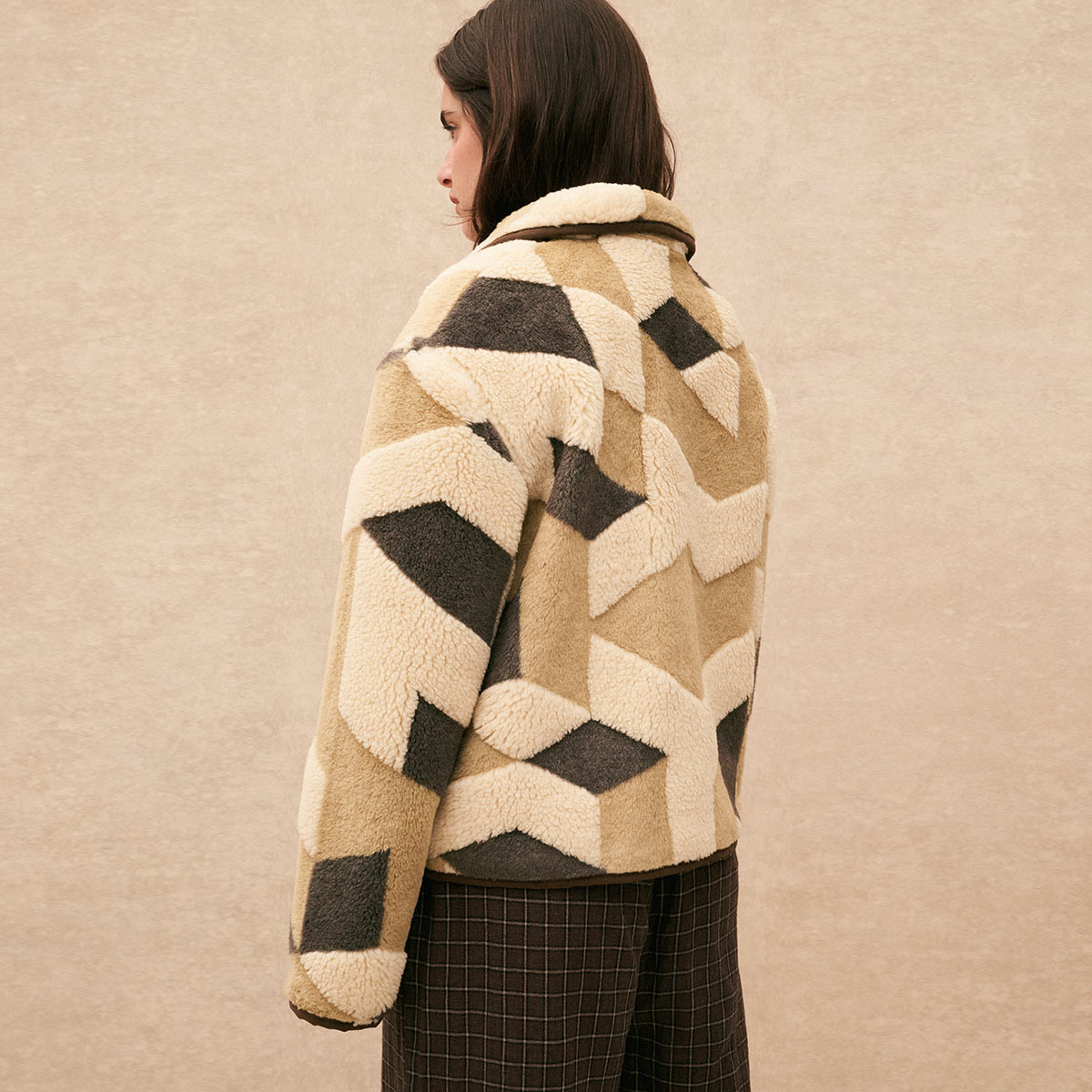 La veste Shirley de HOD Paris séduit par sa coupe ample, son col arrondi et son motif graphique aux teintes naturelles. Confectionnée en mélange de polyester, mohair et laine, elle allie chaleur, confort et style rétro-chic pour un look affirmé.