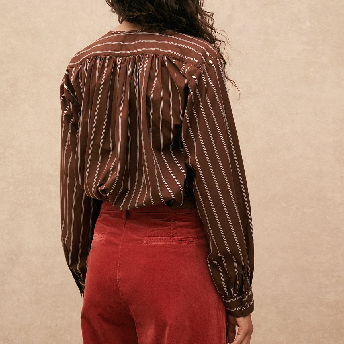 La chemise Cristal de Hartford allie élégance et confort grâce à sa coupe ample en popeline de coton. Sans col, ornée de boutons en nacre et de fines rayures roses, elle signe un look chic, moderne et polyvalent.
