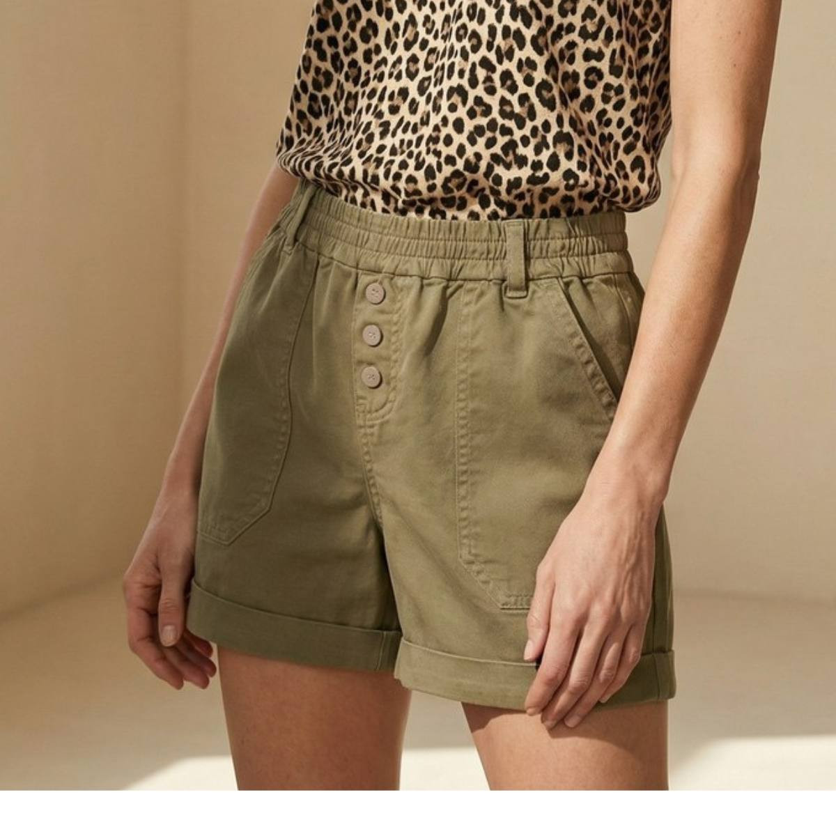 Associations : Avec un haut blanc ou écru pour un accord naturel équilibré. Avec un haut à imprimé animal ou fleuri pour un accord kaki + motif tonné. Avec un haut lemon ou orange pour un accord complémentaire vif. Sandales en cuir naturel ou cognac, espadrilles vertes ou baskets blanches.
