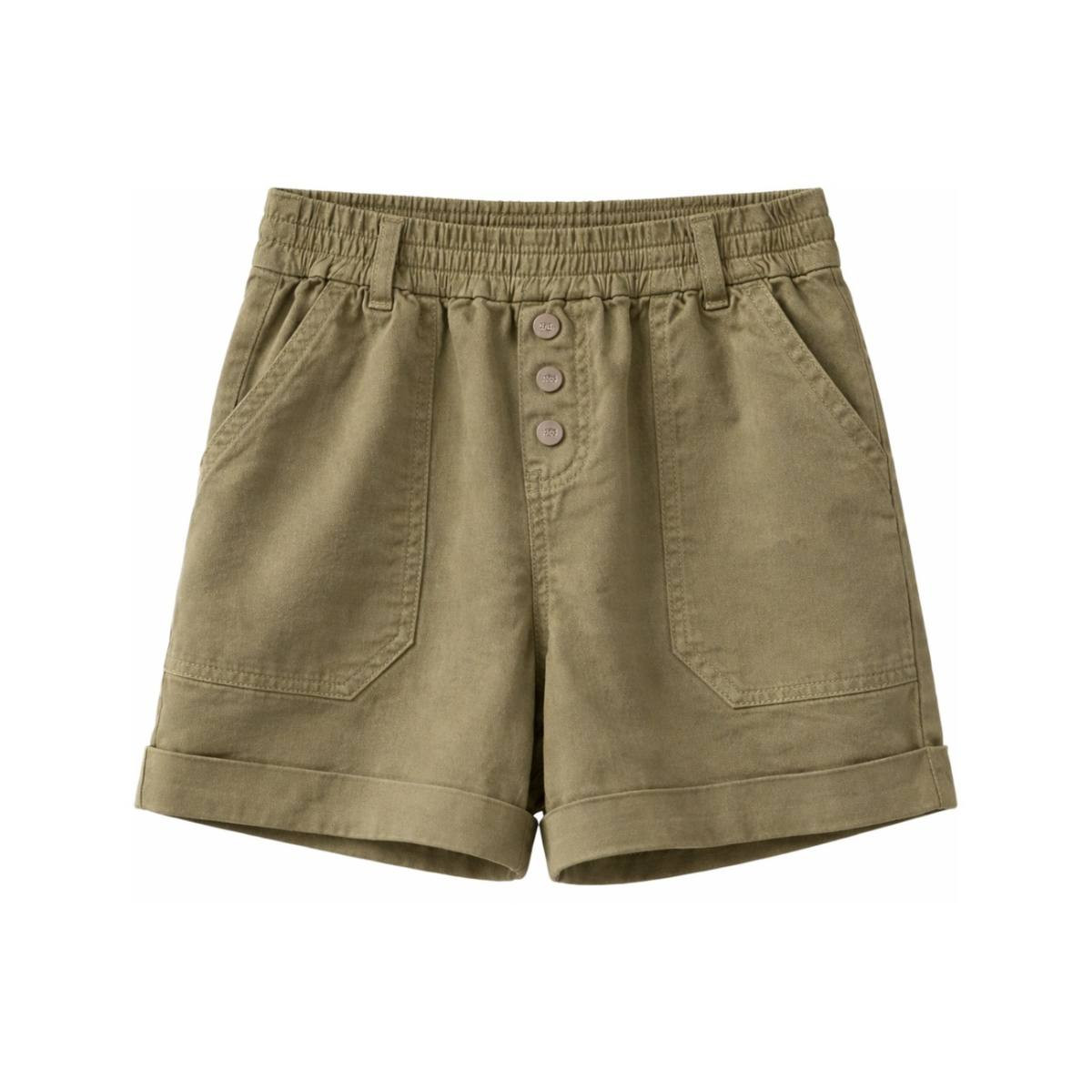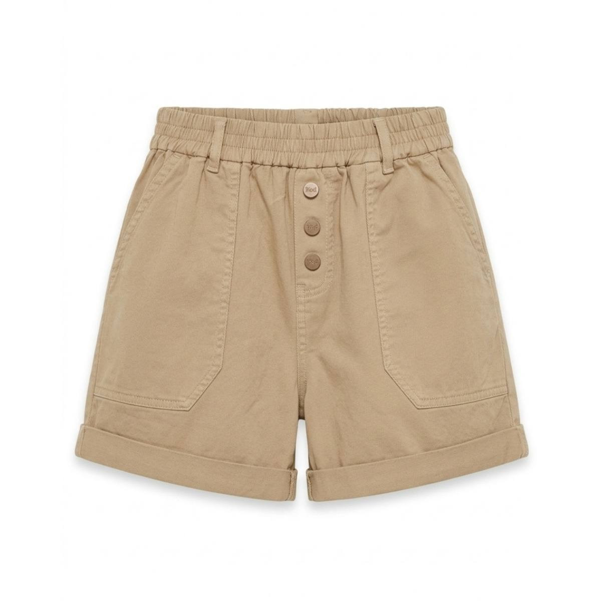 Short large de Hod Paris. 98% coton 2% élasthanne, taille élastique avec passants, fermeture boutons pression, 4 poches, revers en bas. Coloris almond, cream et kaki. Le short parfait pour cet été.