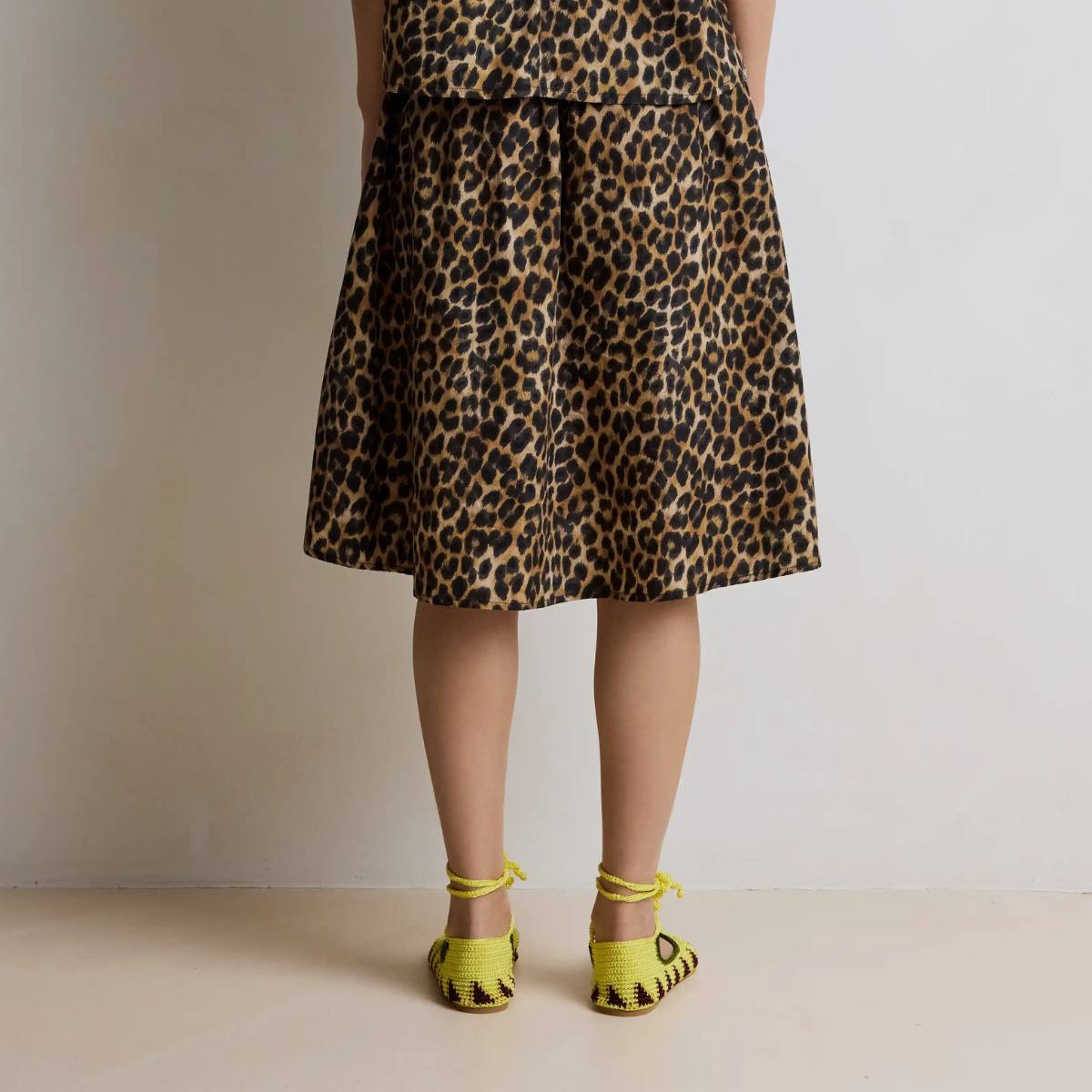 La jupe DAISY est froncée à la ceinture — le tissu est rassemblé et cousु en plis serrés sur l'élastique, puis laissé libre pour s'ouvrir naturellement. Cette construction génère un volume ample et régulier qui tourne à chaque mouvement. Sur un imprimé leo, ce volume dynamique rend le motif vivant — les taches se déforment, s'étirent et se redistribuent selon les plis et les positions, évitant l'effet "papier peint" d'une jupe droite à imprimé figé.