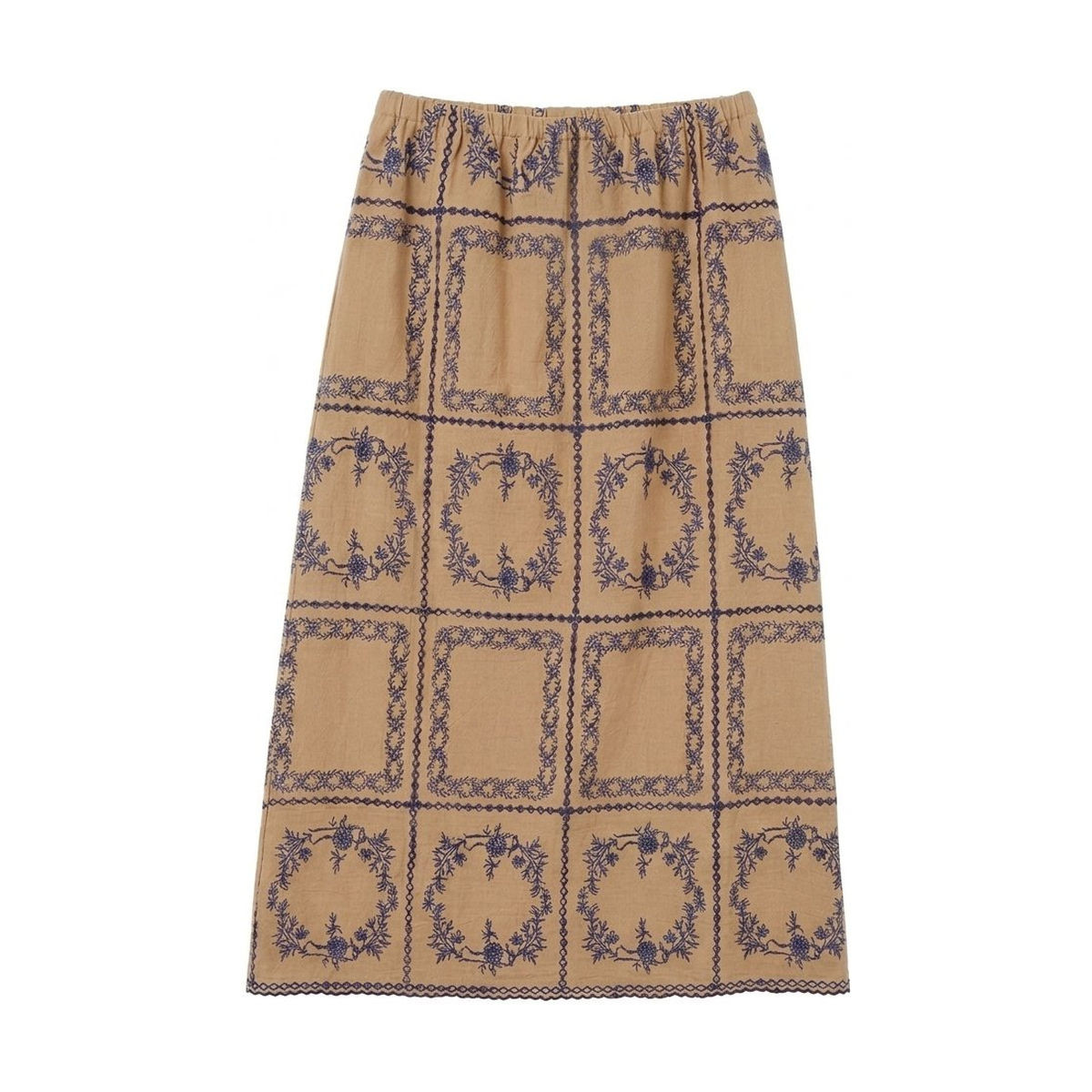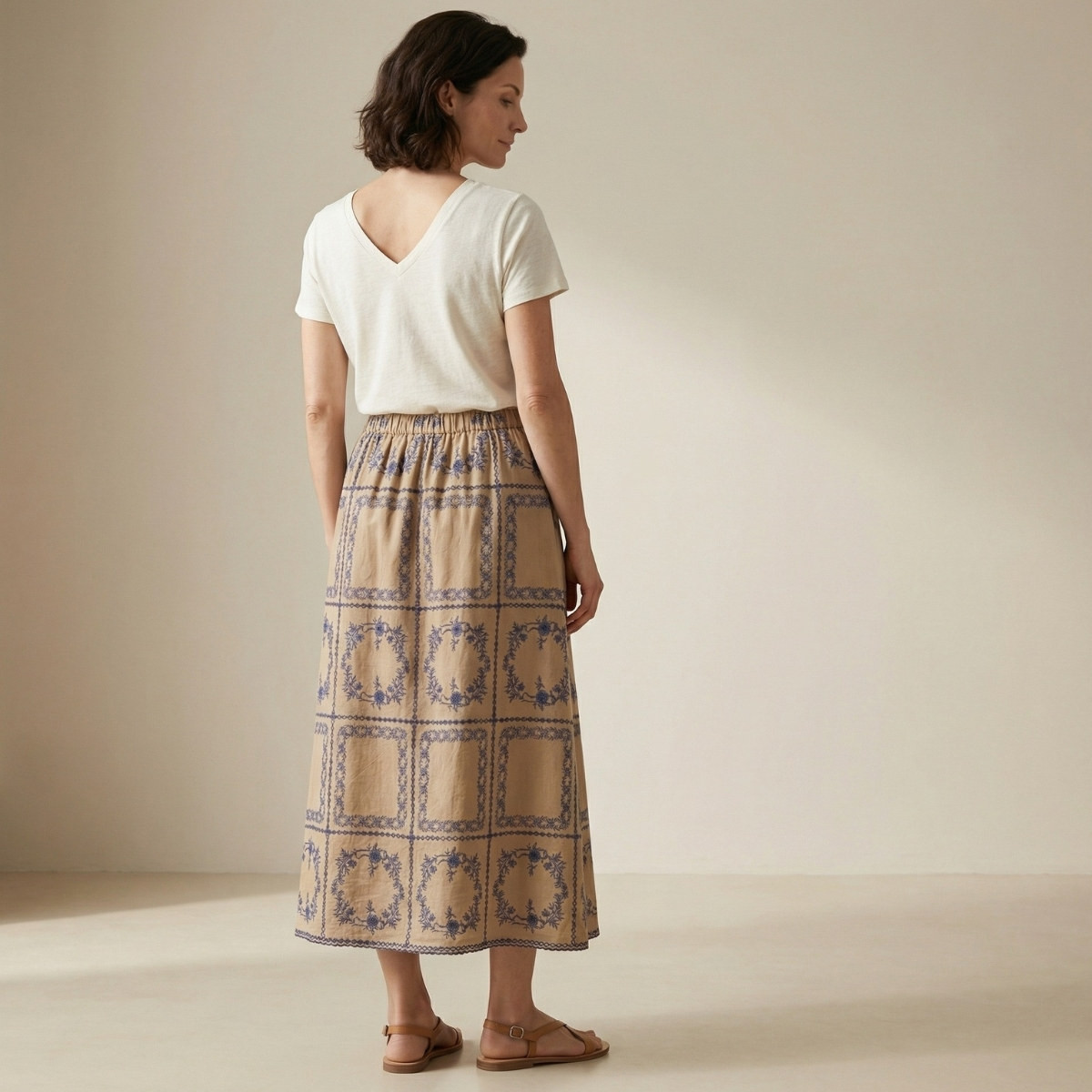 Matière & rendu : Sur tissu fluide (composition à confirmer), le camel présente un rendu mat et doux. Les broderies bleu marine créent un relief visible qui enrichit la surface du tissu d'une dimension artisanale et texturale. La fluidité du tissu permet aux broderies de se mouvoir naturellement avec le tombé de la jupe.