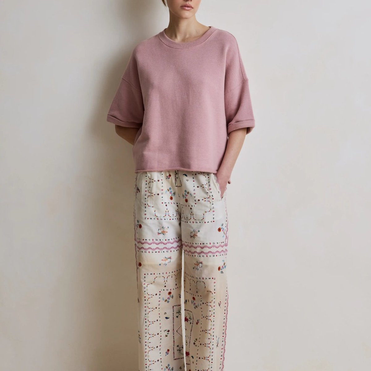Teinte : Rose poudré légèrement lilas, doux et féminin sans être criard. Une teinte rare dans l'univers des sweats décontractés, qui apporte une touche de douceur chromatique immédiate. Le mauve du SOLANGE est plus chaud et plus rosé que le mauve froid — un rose vieilli, poudré et élégant.