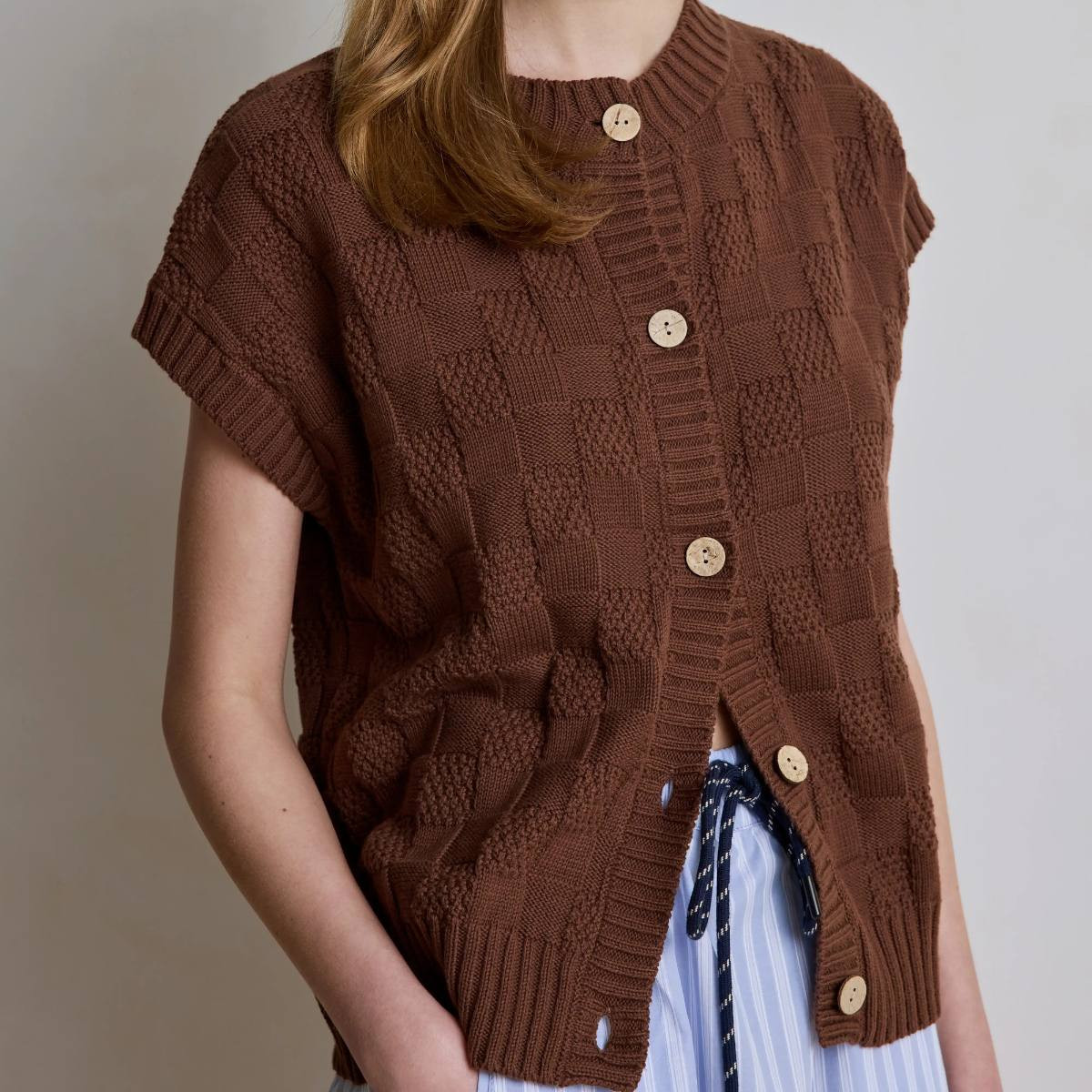 Avec sa maille damier en relief, ses boutons en bois naturel et sa coupe courte polyvalente, le gilet PERLA de Hod Paris est une pièce de mi-saison au caractère bien affirmé. Facile à superposer, confortable à porter et immédiatement élégant, il s'intègre dans tous les dressings qui misent sur les matières naturelles et les détails soignés.