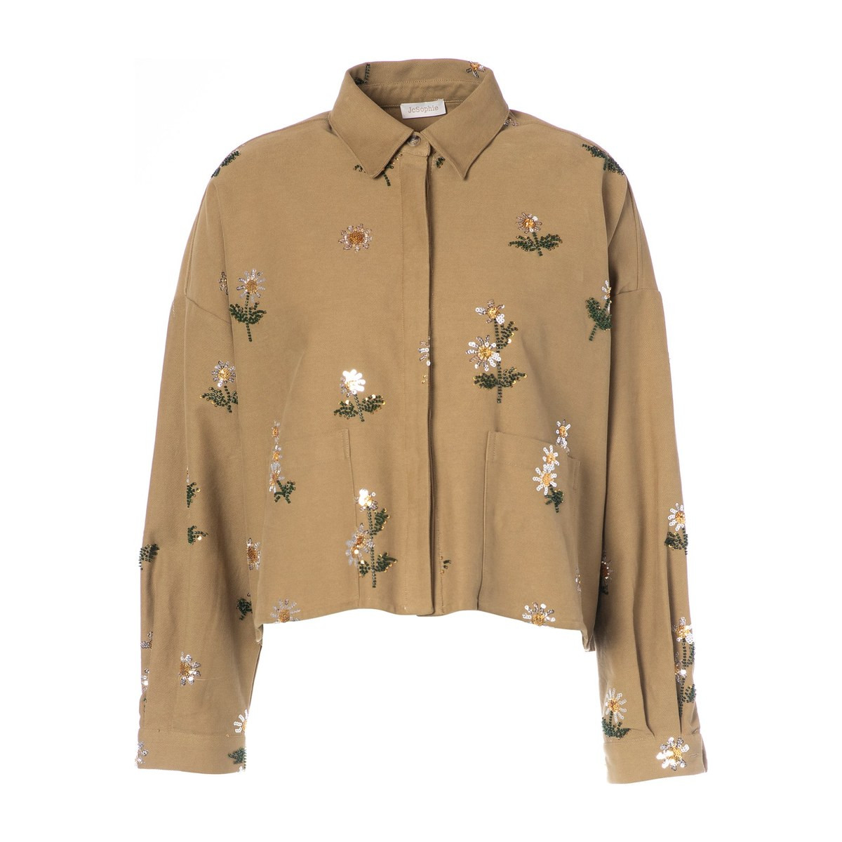 Confectionnée en 100 % coton, la Laura offre une base solide, respirante et confortable qui contraste avec la préciosité de ses broderies. La coupe est oversize et raccourcie, tombant juste sous la taille avec une largeur d'épaule généreuse et des manches longues légèrement amples. Le col chemisier classique structure l'encolure et ancre la pièce dans un registre veste-chemise décontractée, loin de tout formalisme. La fermeture boutonnée dissimulée sous une patte de boutonnage soignée préserve la lisibilité des broderies en façade. Deux poches plaquées basses viennent compléter la construction, fonctionnelles et discrètes, elles aussi ornées de broderies florales. Les manches, larges et tombantes, offrent une liberté de mouvement totale au porté.