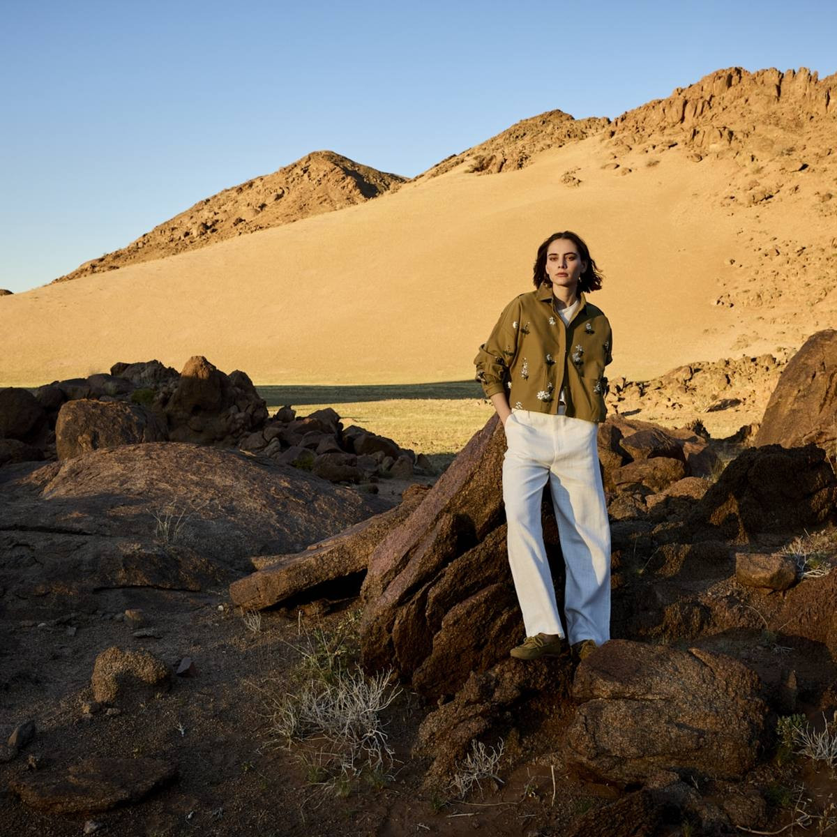 Teinte — Kaki chaud et profond, teinté d'une nuance dorée dans certaines lumières. Un Army green dense et généreux, ni trop militaire ni trop terreux — un fond chromatique qui met naturellement en valeur les broderies florales qui le recouvrent.