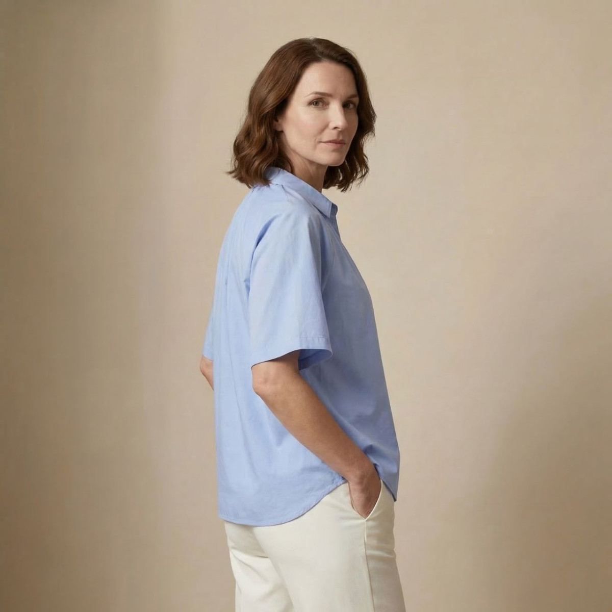 La LEONORE en white est une blouse de dressing capsule — universelle, neutre, associable à tout. Elle est la base qui s'efface derrière les accessoires et les bas, la pièce dont on a toujours besoin sans jamais vraiment la remarquer. La LEONORE en lavender blue est une blouse de caractère doux — elle a une identité coloristique propre, une palette qui lui appartient, une présence visuelle légère mais perceptible. Elle s'affiche un peu plus que le blanc, attire l'œil avec discrétion. Les deux ensemble couvrent pratiquement tous les besoins d'une blouse loose fit en coton au quotidien.