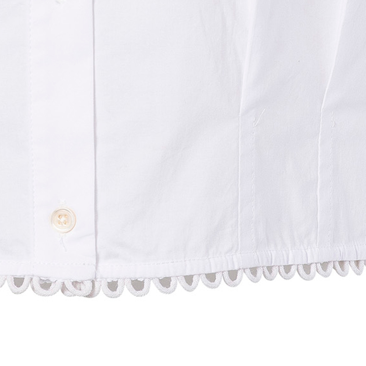 Le col chemisier classique à pointes ancre immédiatement la LANCELOT dans le registre habillé et construit. Sur une blouse courte brodée, il équilibre la légèreté des détails ornementaux par une construction rigoureuse — c'est cette tension entre l'ornement brodé et la rigueur du col chemisier qui donne à la LANCELOT tout son caractère JC Sophie. Le boutonnage façade complète cette construction en offrant trois façons de porter : entièrement boutonné pour une allure chemisier net, partiellement ouvert pour une lecture décontractée, ou ouvert sur un caraco pour une superposition légère.