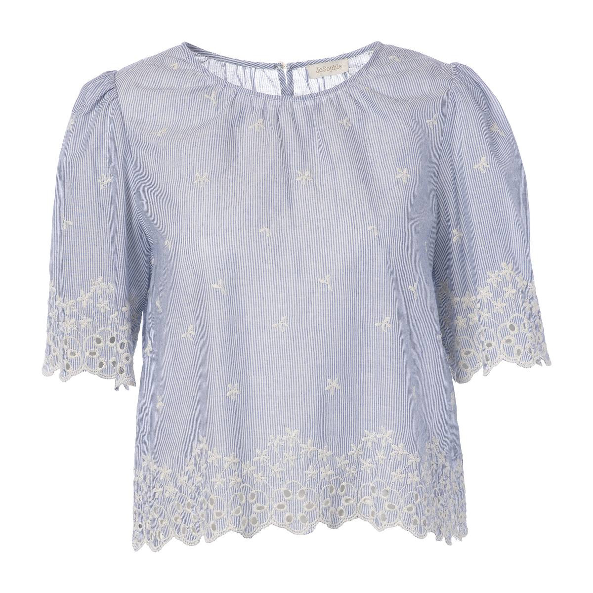 La construction de la blouse LAZARE est soignée de l'encolure à l'ourlet. Le col est froncé — le tissu rayé est rassemblé en petits plis réguliers à l'encolure ronde, créant une ligne douce et légèrement volumineuse à l'épaule, bien éloignée de la platitude d'un col plat. Les manches courtes partent d'une légère bouffante à l'emmanchure avant de tomber sur une bordure de broderie anglaise ajourée — œillets ronds et motifs floraux découpés, terminés par un bord festonné en dents de scie. Ce même travail de broderie anglaise encadre l'ourlet sur toute la largeur de la blouse, dans une composition florale plus dense que celle des manches.