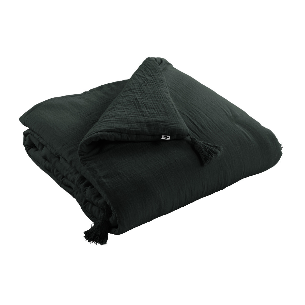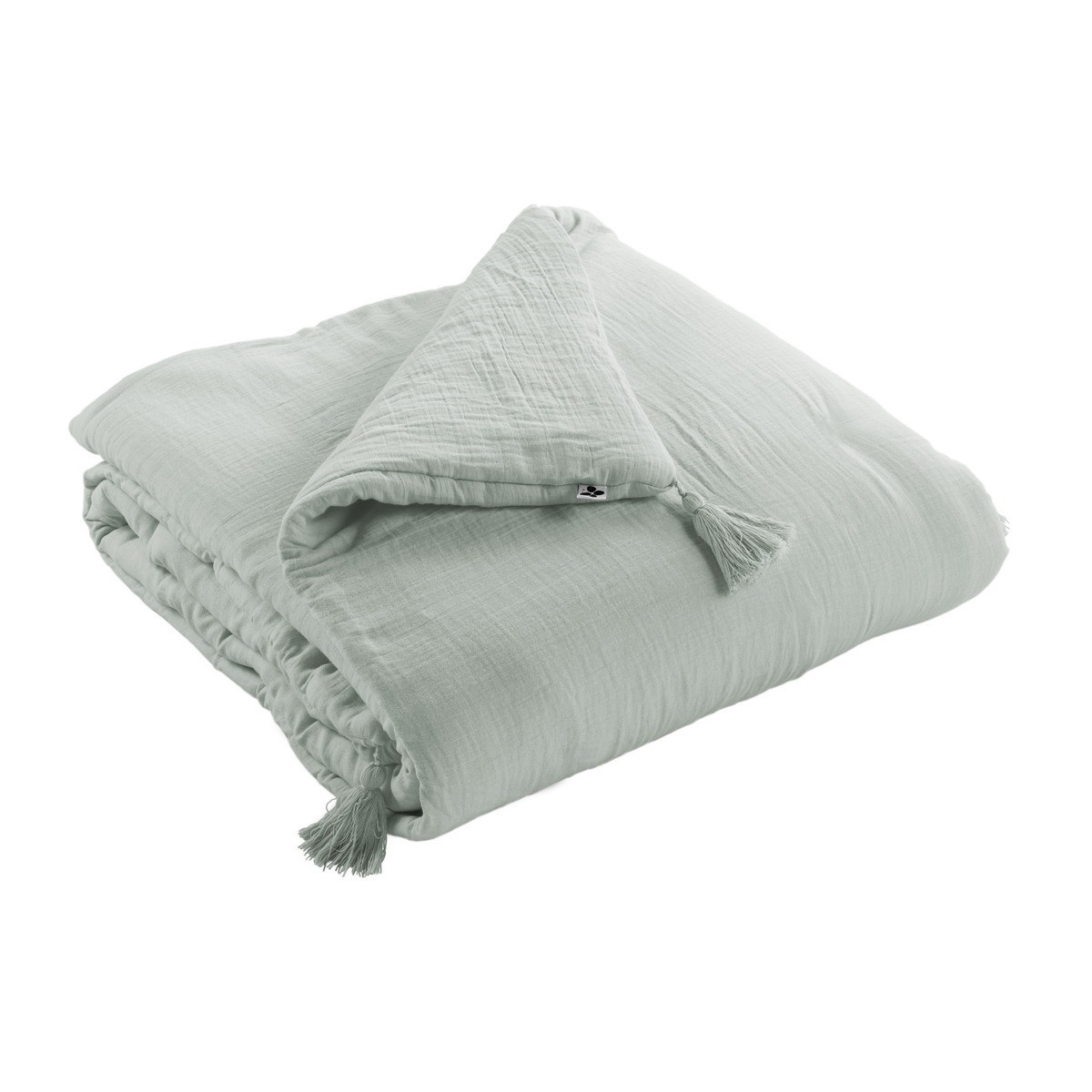 Confectionné en double gaze de coton 100 % au grammage 125 gr/m², cet édredon conjugue légèreté vaporeuse et chaleur enveloppante grâce à son garnissage polyester 300 gr/m². La technique double gaze superpose deux couches de coton finement tissées pour créer une matière à la fois fluide et isolante, qui respire naturellement tout en conservant la chaleur corporelle. Les quatre pompons positionnés aux angles apportent cette signature artisanale qui distingue une création textile d'un produit industriel standard.