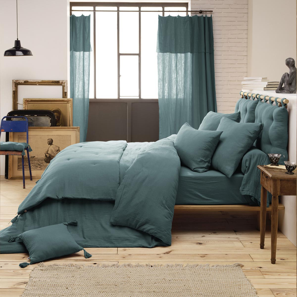 Cet édredon double gaze coton thermorégulateur s'intègre naturellement dans une chambre qui privilégie les matières authentiques — lin naturel, bois brut, rotin tressé — sans nécessiter une coordination parfaite avec l'ensemble du linge de lit. Décliné dans une riche palette chromatique pensée pour s'harmoniser avec tous les univers déco, il se marie avec nos autres créations linge de lit et nos coussins décoratifs pour créer une cohérence textile personnalisée dans toute la chambre.