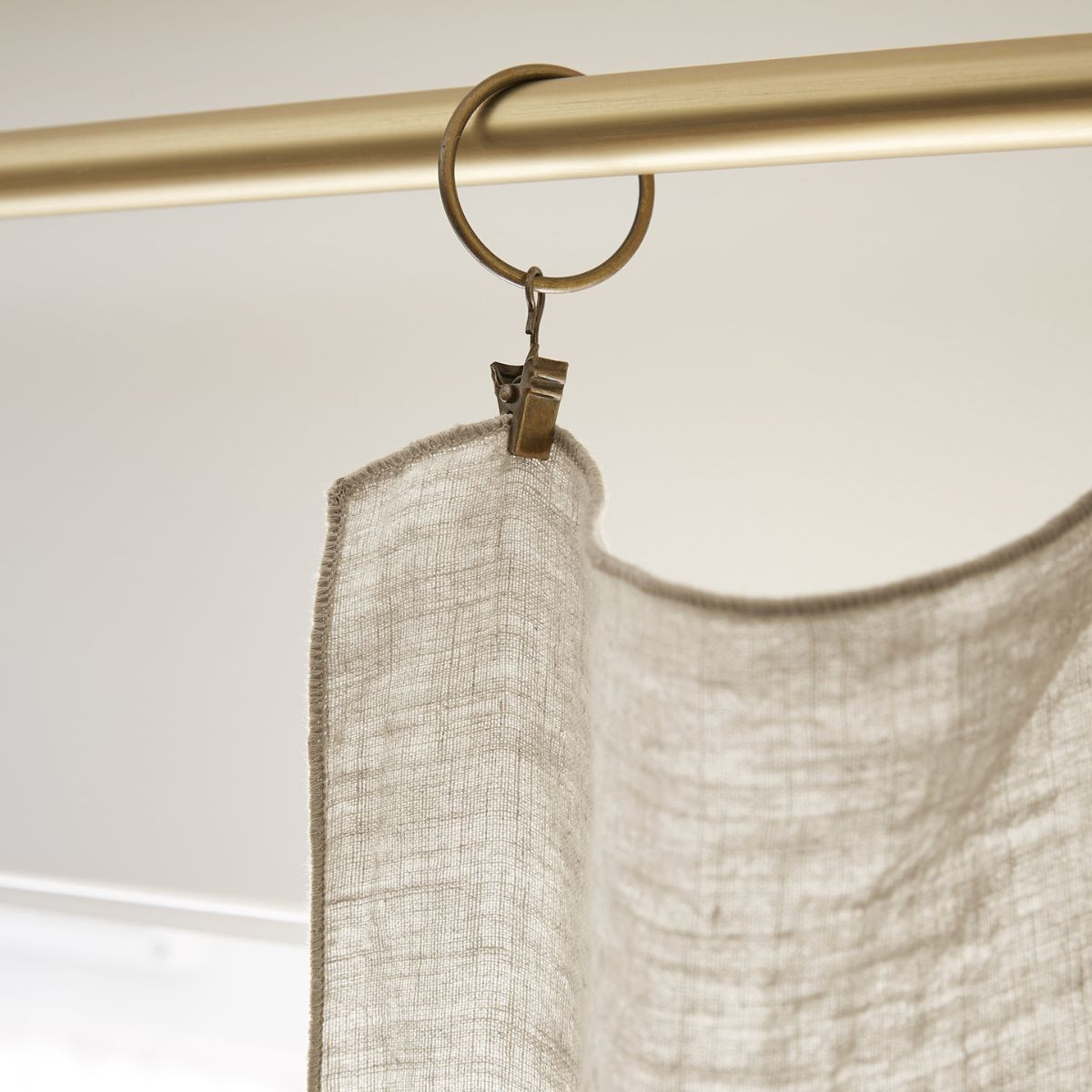 Les anneaux pinces fournis avec le rideau SOLINE ont un diamètre intérieur de 3,8 cm — une dimension standard qui s'adapte aux tringles de diamètre courant (de 16 à 28 mm selon le jeu disponible). La finition métal bronze-antiquaire des anneaux s'accorde avec la majorité des tringles actuelles, qu'elles soient en laiton brossé, en acier noirci ou en bois naturel. Le principe de la pince permet de saisir directement le bord supérieur du rideau sans ourlet de tête, passants ni œillets — la pose se fait en quelques minutes et la hauteur est réglable à volonté. Le sachet en tissu assorti livré avec les anneaux permet de ranger ces derniers en toute discrétion entre deux utilisations.
