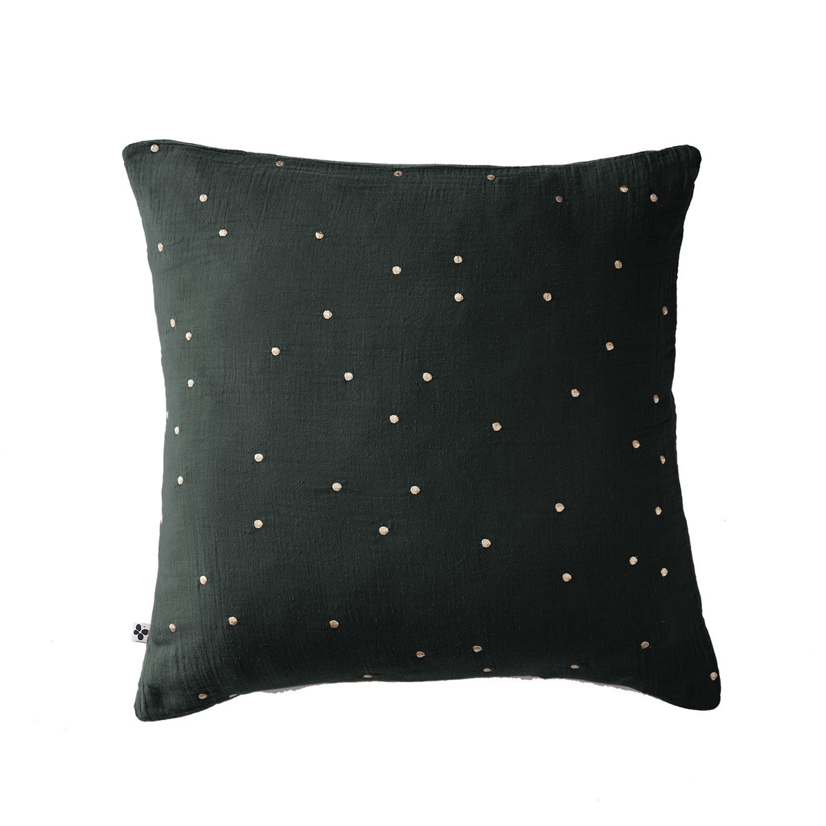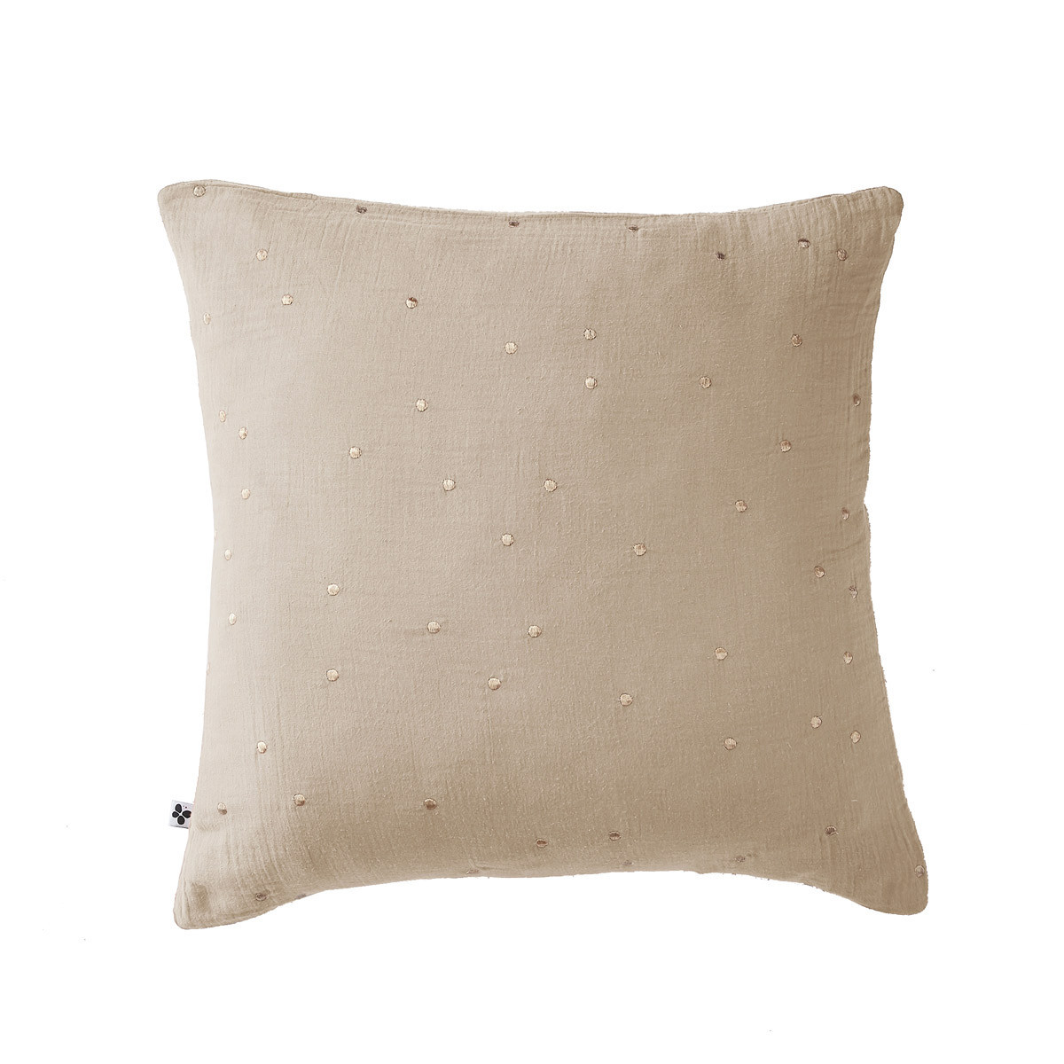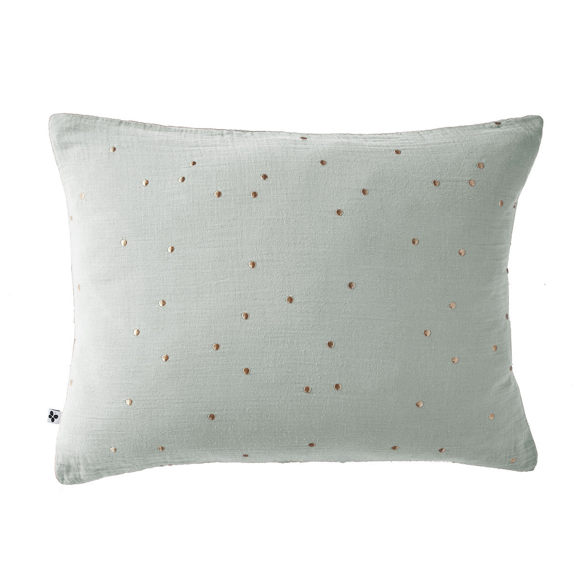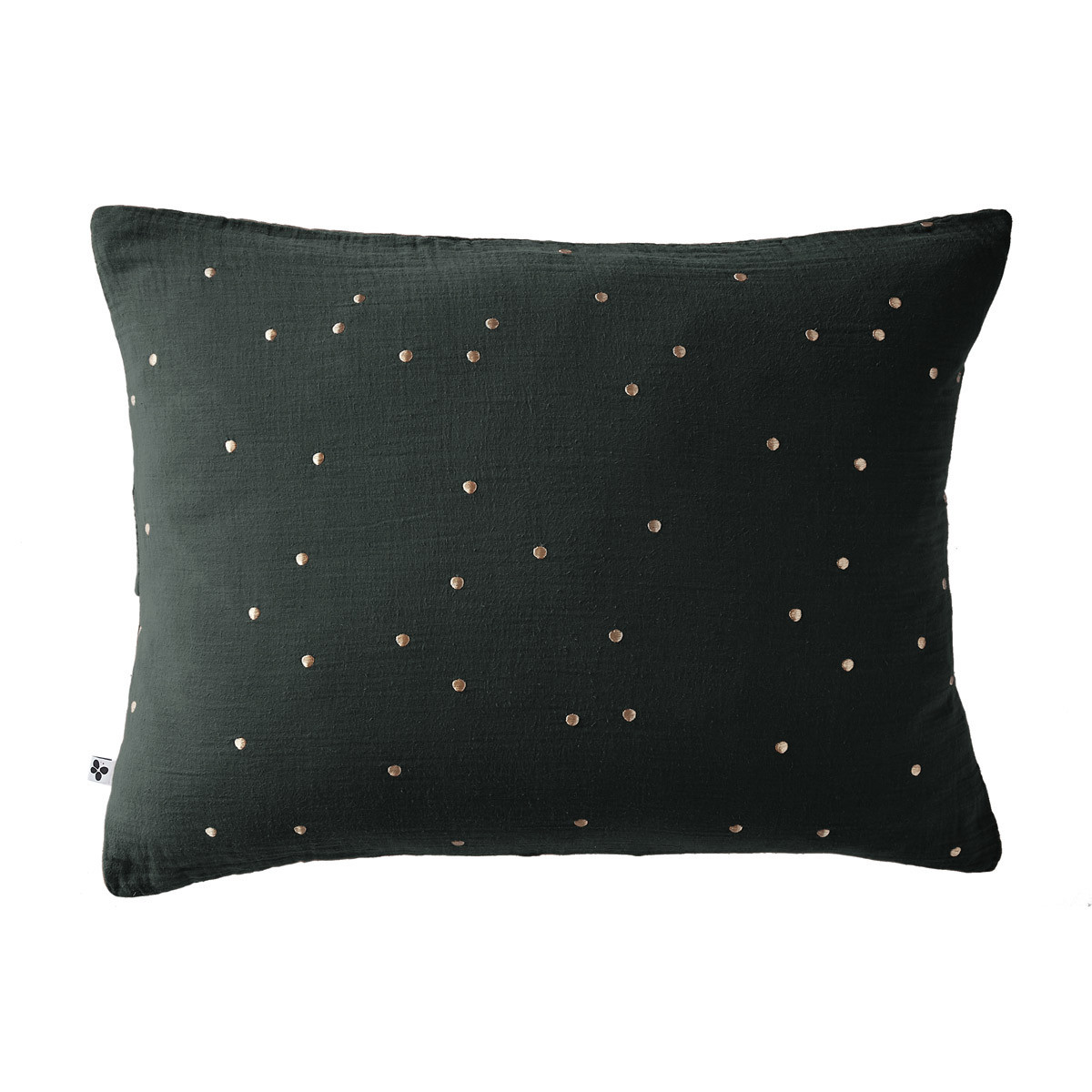 Confectionnée en 100% double gaze de coton avec un grammage de 125 gr/m², elle offre une douceur extrême et une respirabilité idéale pour un sommeil de qualité. Le secret de son élégance réside dans sa finition : de subtils pois brodés (ou sequins discrets) viennent parsèmer la taie, lui conférant une note de lumière et de sophistication. Pratique, sa fermeture portefeuille avec rabat assure un maintien parfait de l'oreiller.