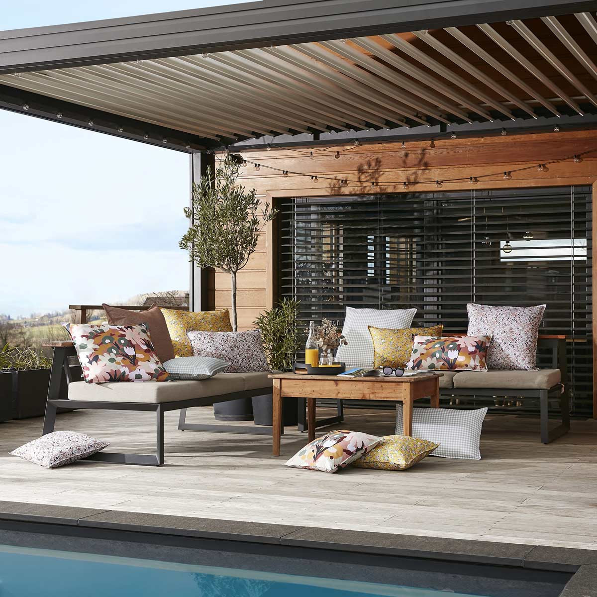 Cette housse coussin extérieur résistant s'intègre naturellement dans un aménagement outdoor qui mélange les matières authentiques — teck patiné, rotin tressé, métal thermolaqué — sans avoir besoin d'un ensemble parfaitement coordonné. Associée à nos autres créations outdoor et nos coussins d'intérieur pour créer un pont déco entre dedans et dehors, elle compose un salon de jardin aux textures contrastées qui privilégient l'harmonie naturelle.