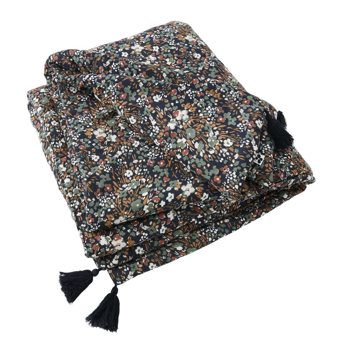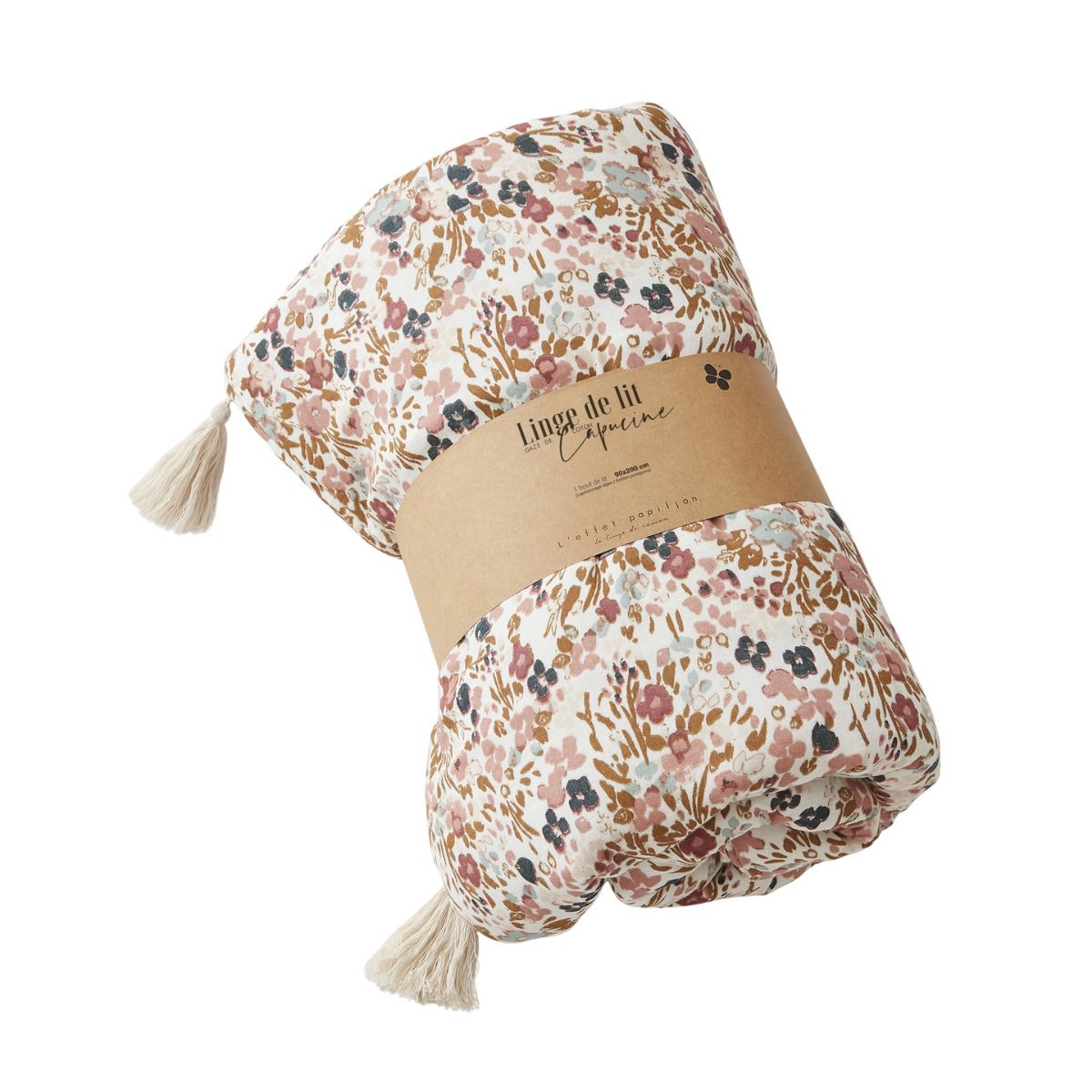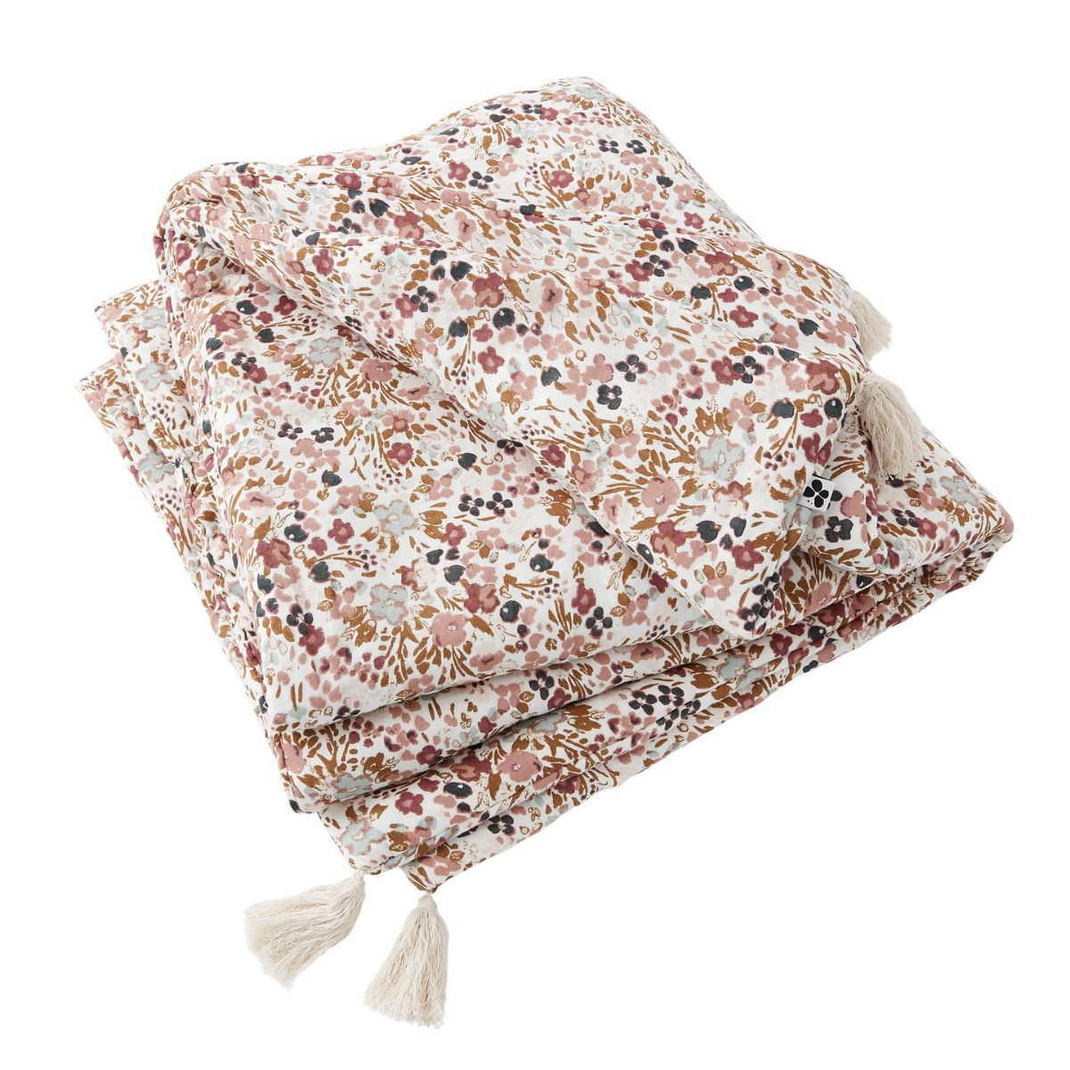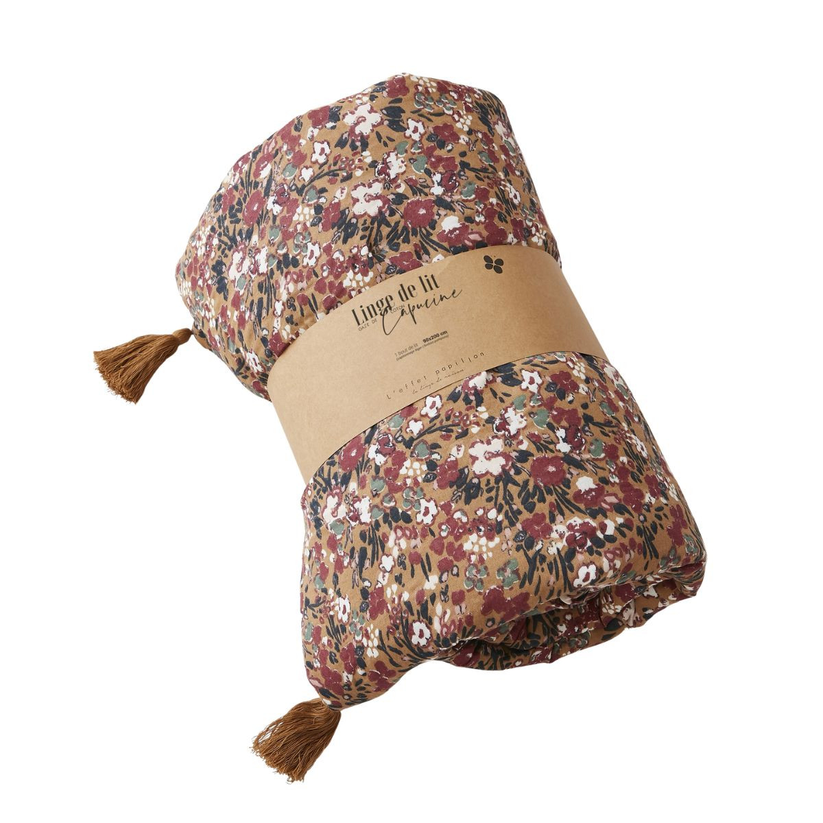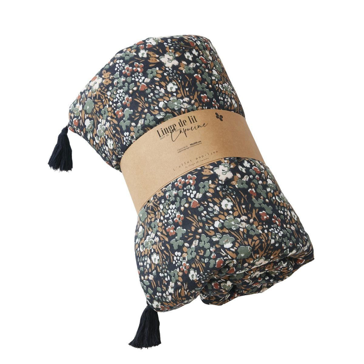Laissez-vous surprendre par CAPUCINE — un édredon matelassé en double gaze de coton qui combine la chaleur d'un vrai garnissage et la richesse d'un motif floral champêtre dense, finitionné de quatre pompons aux angles qui en font une pièce à part entière.