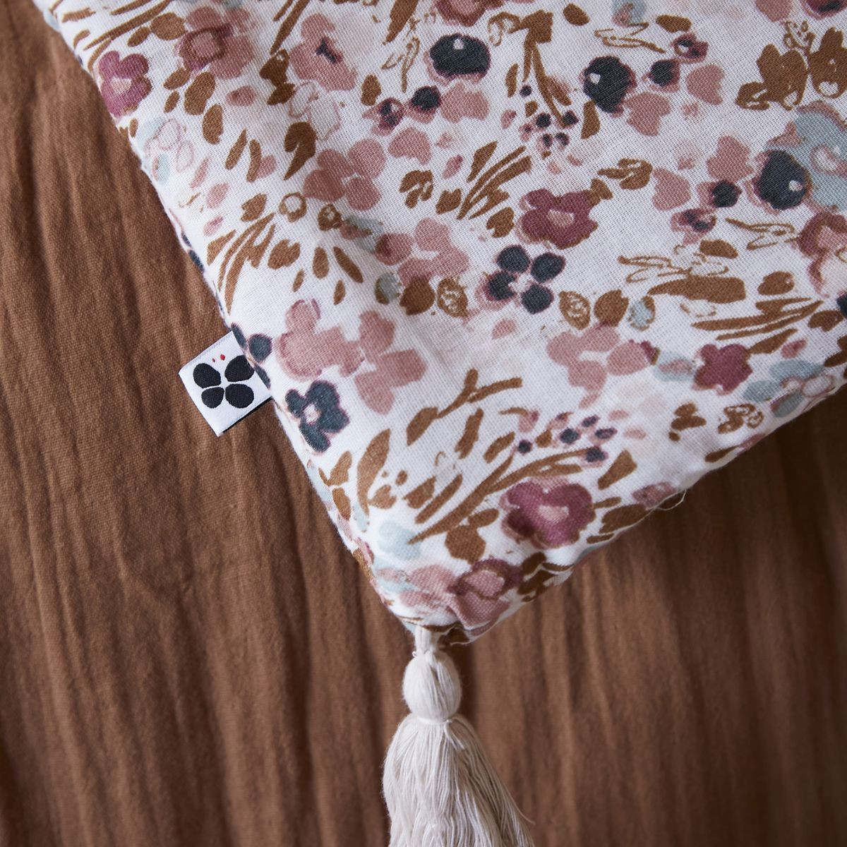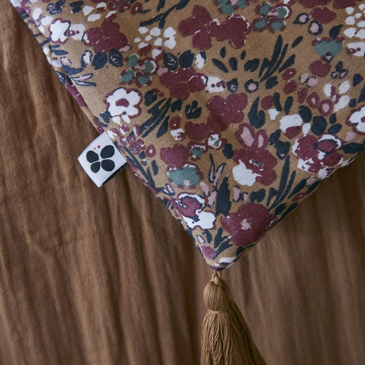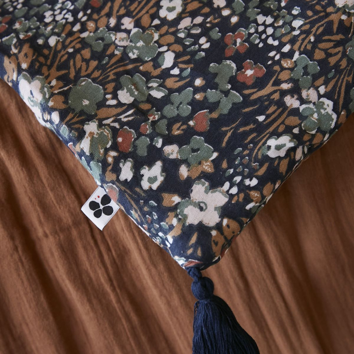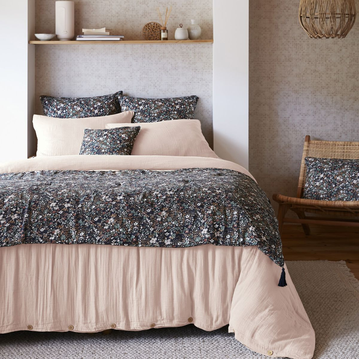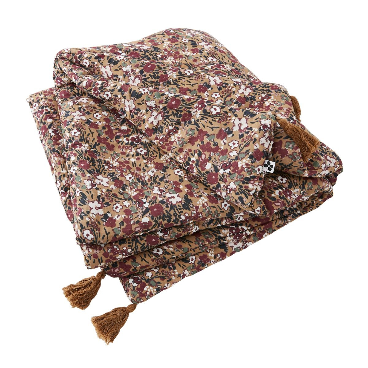 Laissez-vous surprendre par CAPUCINE — un édredon matelassé en double gaze de coton qui combine la chaleur d'un vrai garnissage et la richesse d'un motif floral champêtre dense, finitionné de quatre pompons aux angles qui en font une pièce à part entière.