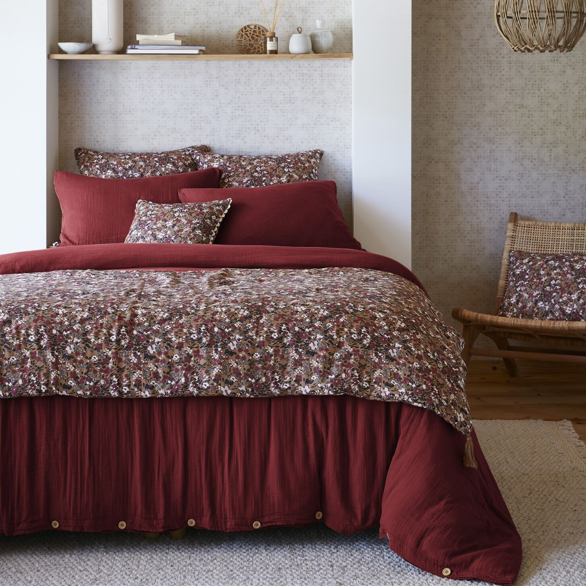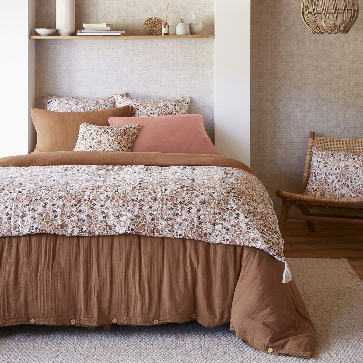 Il s'intègre naturellement sur un lit habillé de gaze unie, de lin ou de coton lavé — la richesse du motif fait le travail décoratif sans nécessiter d'autres éléments imprimés.