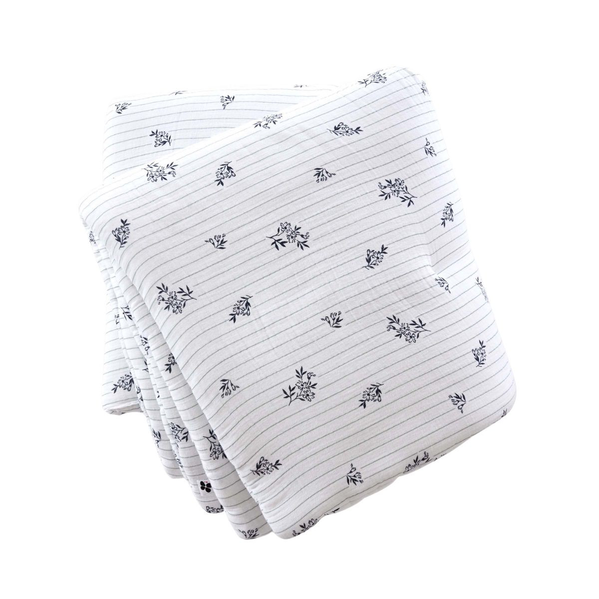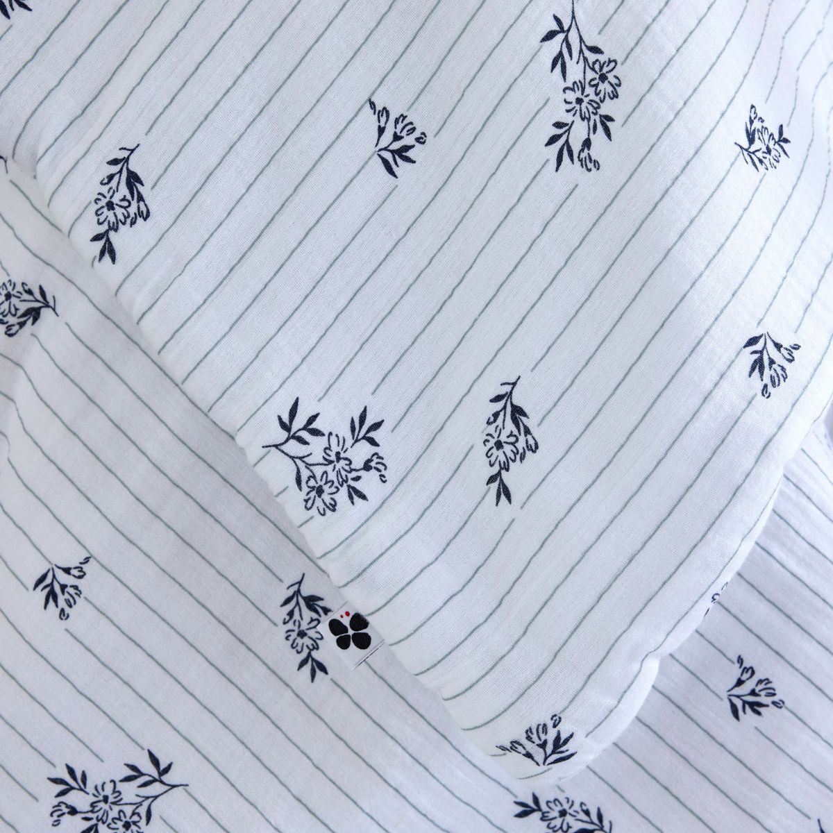 La double gaze imprimée est plus sensible à la chaleur qu'une double gaze unie — les pigments imprimés sur les fibres réagissent différemment aux températures élevées, et le bleu marine fin des bouquets peut s'adoucir ou se déplacer légèrement à 40°C ou plus. Le lavage à 30°C préserve la netteté du motif dans la durée. L'absence de sèche-linge protège la structure du garnissage polyester à 300 gr/m² — un séchage à chaleur directe peut agglomérer les fibres et créer des zones de compactage. Le séchage à plat garantit une répartition homogène du filling.