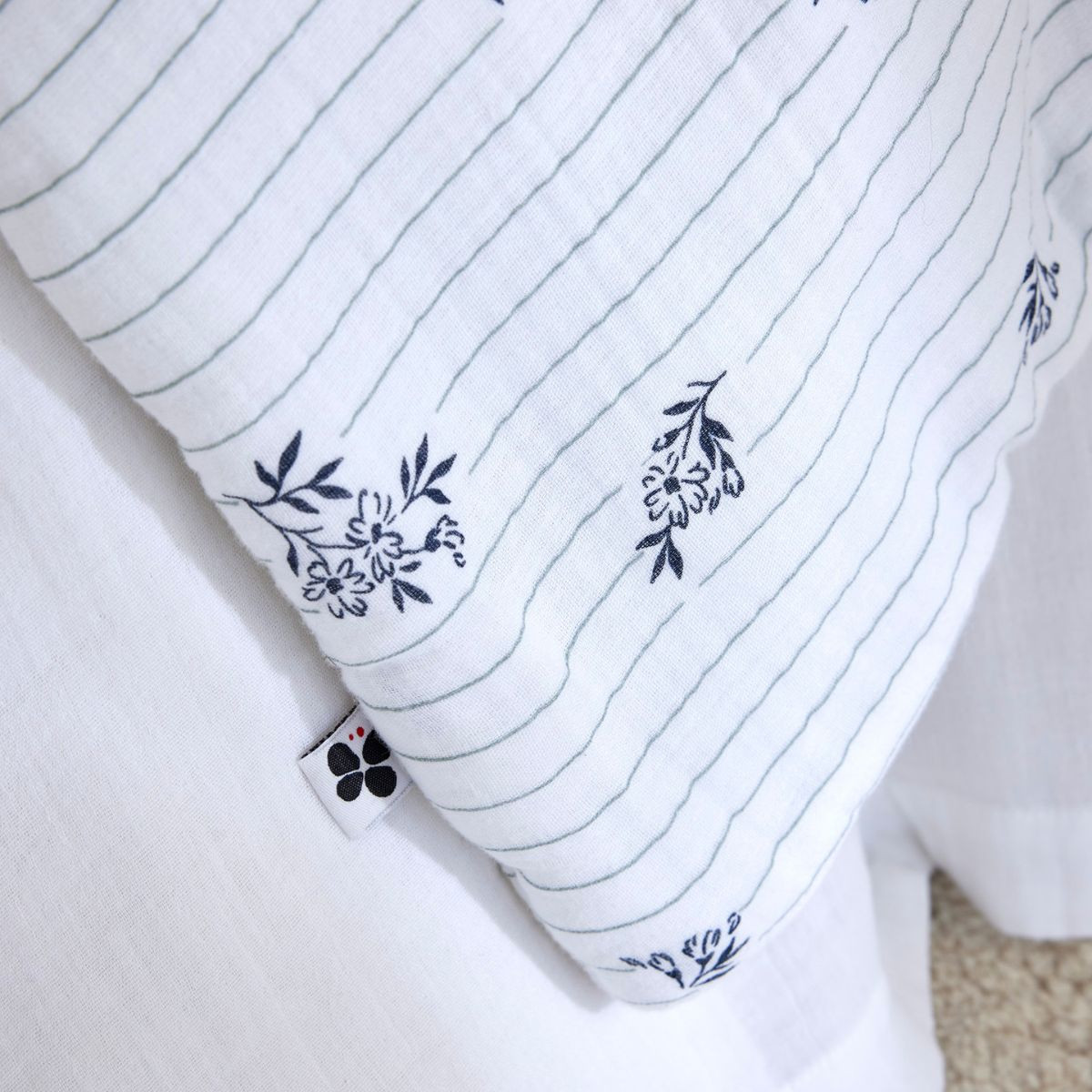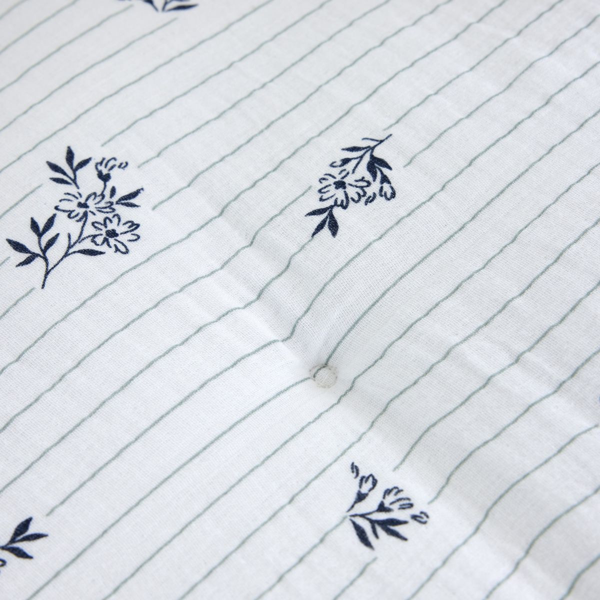 Ses petits bouquets floraux bleu marine épars sur fond blanc rayé habillent la surface de l'édredon avec la même légèreté qu'une nappe de lumière — le motif est là, présent, sans jamais s'imposer.