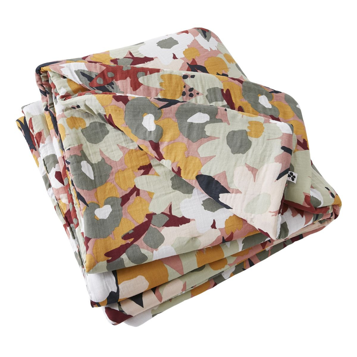 Laissez-vous séduire par l'énergie de l'édredon LÉANE : une double gaze de coton imprimée de formes abstraites libres, organiques et généreuses, qui transforme le pied du lit en véritable déclaration visuelle. La légèreté caractéristique de la gaze — sa trame ouverte, son toucher souple — contraste avec la densité du motif imprimé, créant une pièce textile aussi vive à l'œil que douce au toucher.
