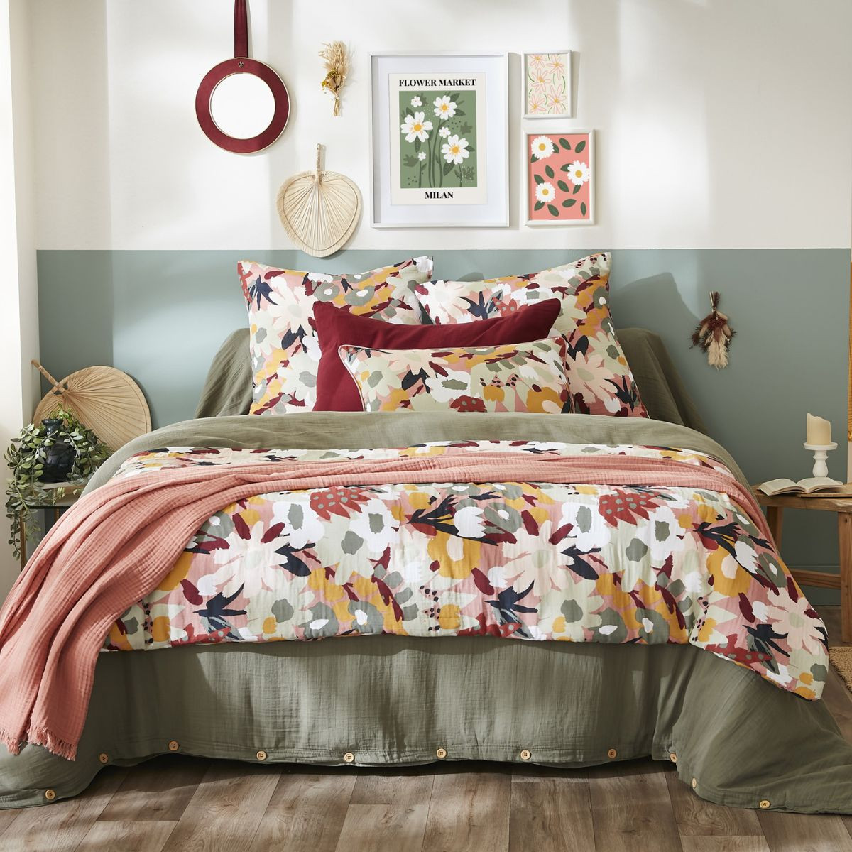 Conçu en enveloppe 100 % coton double gaze à 125 gr/m², l'édredon LÉANE associe la légèreté de la gaze à un garnissage en 100 % polyester de 300 gr/m² — un volume généreux qui lui confère corps, présence et bonne reprise de forme après utilisation. La finition passepoil ceinture les quatre côtés d'un liseré tendu et net, qui cadre le motif imprimé avec précision. Son format de 90 × 200 cm est dimensionné pour s'étendre sur la largeur d'un lit double standard, avec une tombée équilibrée de chaque côté.