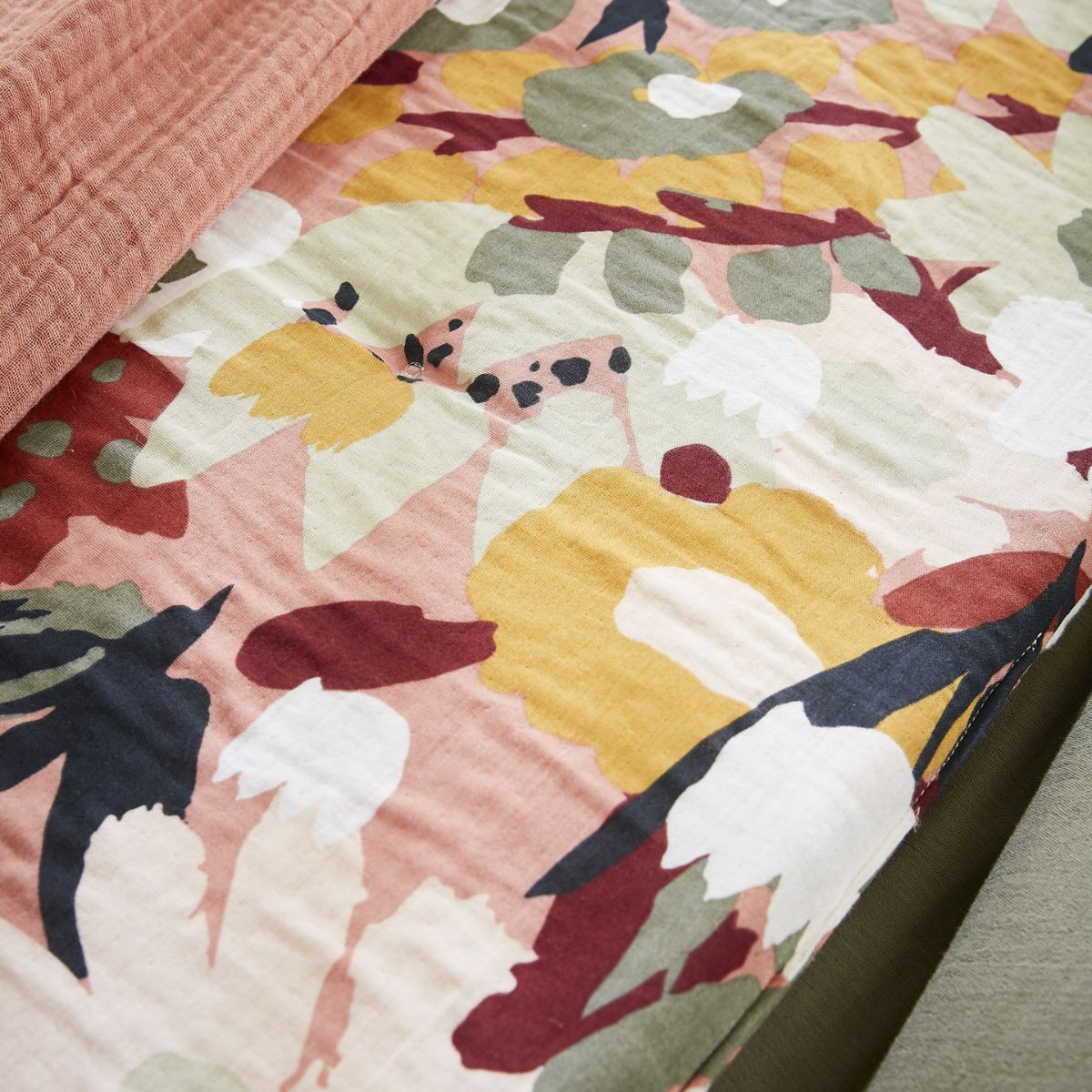Laissez-vous séduire par l'énergie de l'édredon LÉANE : une double gaze de coton imprimée de formes abstraites libres, organiques et généreuses, qui transforme le pied du lit en véritable déclaration visuelle. La légèreté caractéristique de la gaze — sa trame ouverte, son toucher souple — contraste avec la densité du motif imprimé, créant une pièce textile aussi vive à l'œil que douce au toucher.