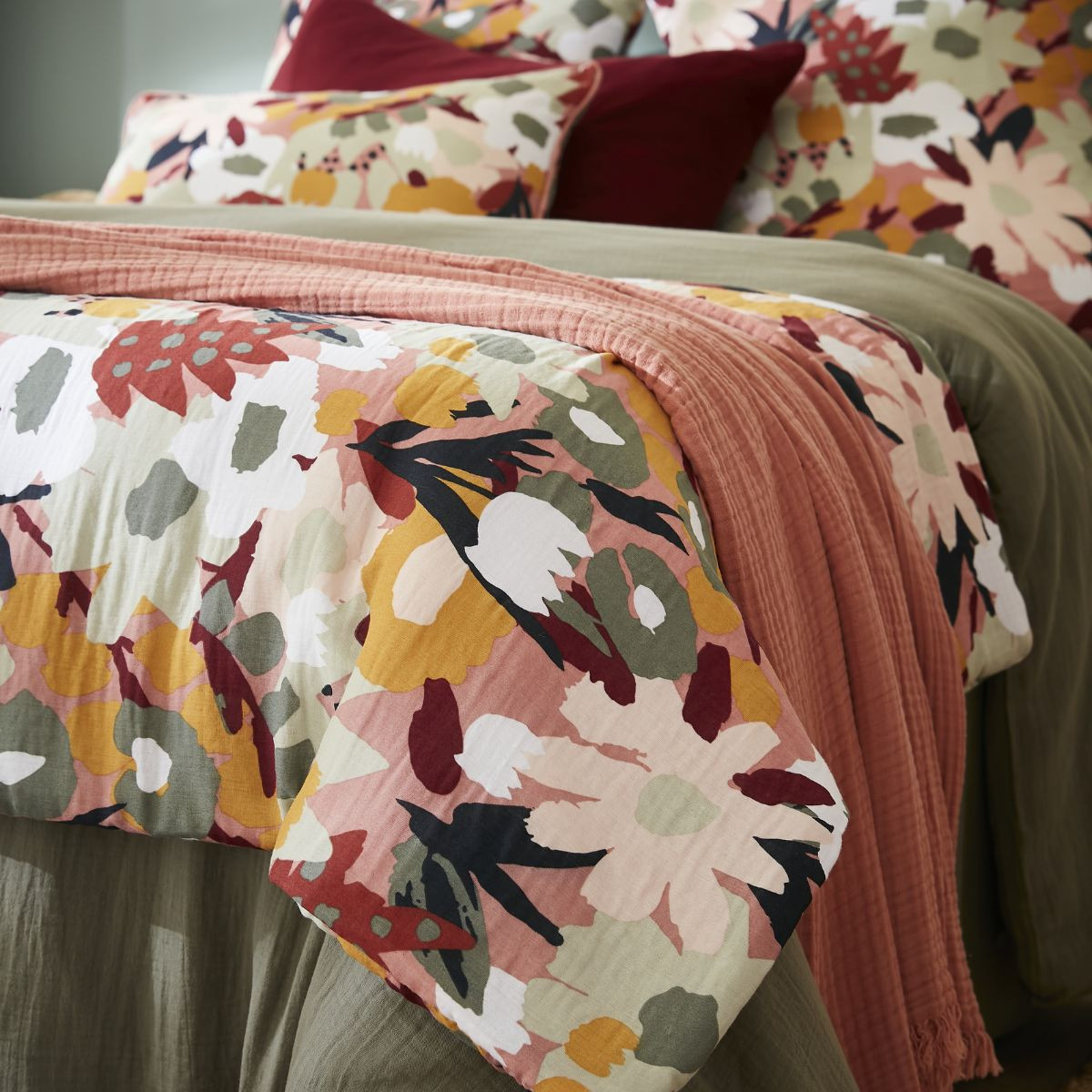 L'abstrait comme poésie : quand les formes libres habitent la chambreDes formes libres, organiques, généreuses — ni fleurs, ni feuilles, mais quelque chose entre les deux. Le motif de la collection LÉANE appartient à cette catégorie de l'abstrait qui respire : chaque forme semble posée à main levée, avec l'assurance de qui n'a pas besoin de perfection pour convaincre. Sur la double gaze, les contours de ces formes sont légèrement diffus