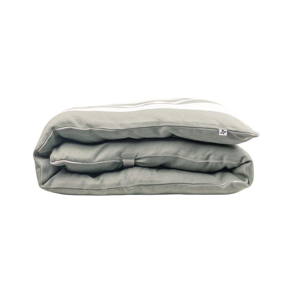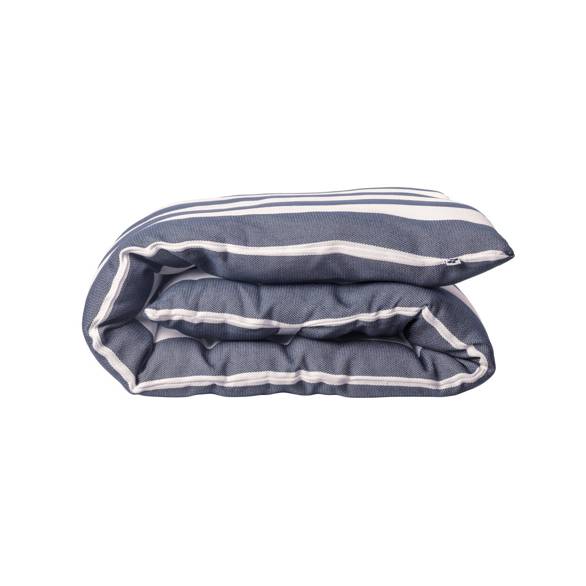 Contraste — Larges bandes blanches vives, très marquées sur ce fond sombre, aux allures sportswear chic. La séquence de rayures est bien visible sur le dessus de la housse repliée.