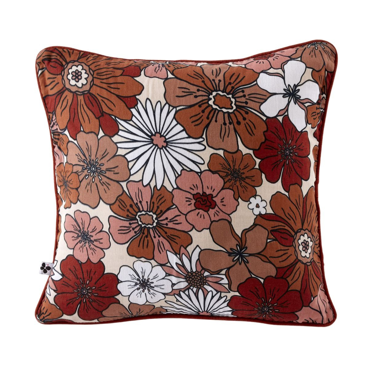 Laissez-vous emporter par ANNA — un coussin qui porte le même élan joyeux et assumé que la collection : grandes fleurs graphiques tracées au trait noir sur fond crème, dans une palette terracotta, bordeaux et rose poudré directement inspirée des années flower power.