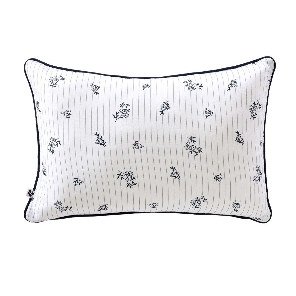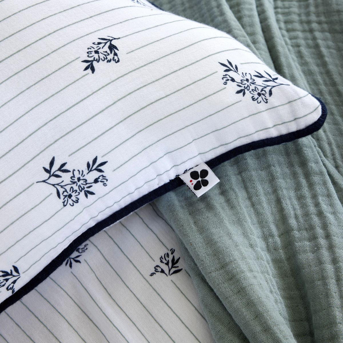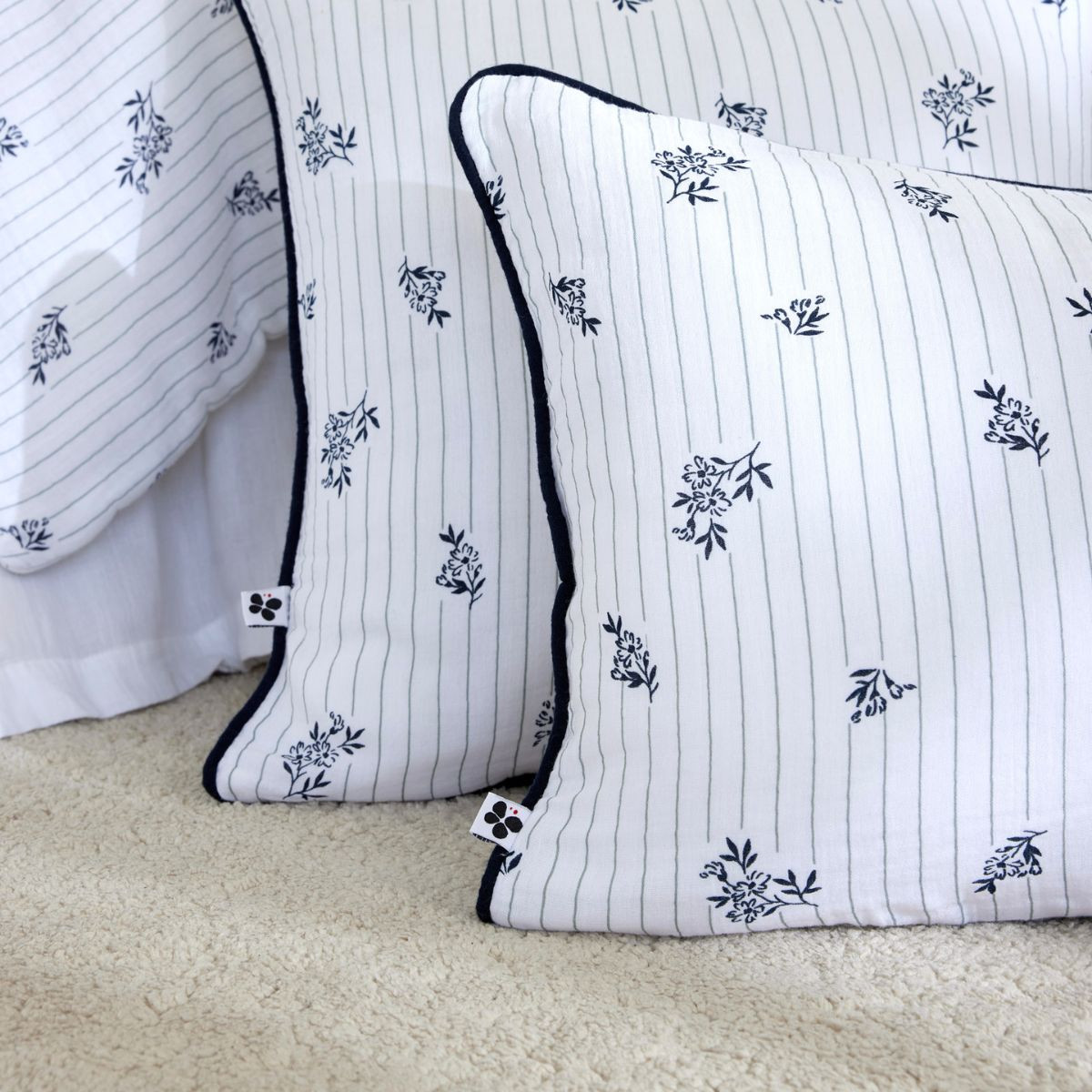 Un passepoil bleu marine souligne les bords des deux formats, reprenant la teinte des bouquets floraux et des fines rayures du motif — un détail de finition qui structure la pièce et la relie visuellement à la housse de couette ELÉONORE côté Chantilly uni.