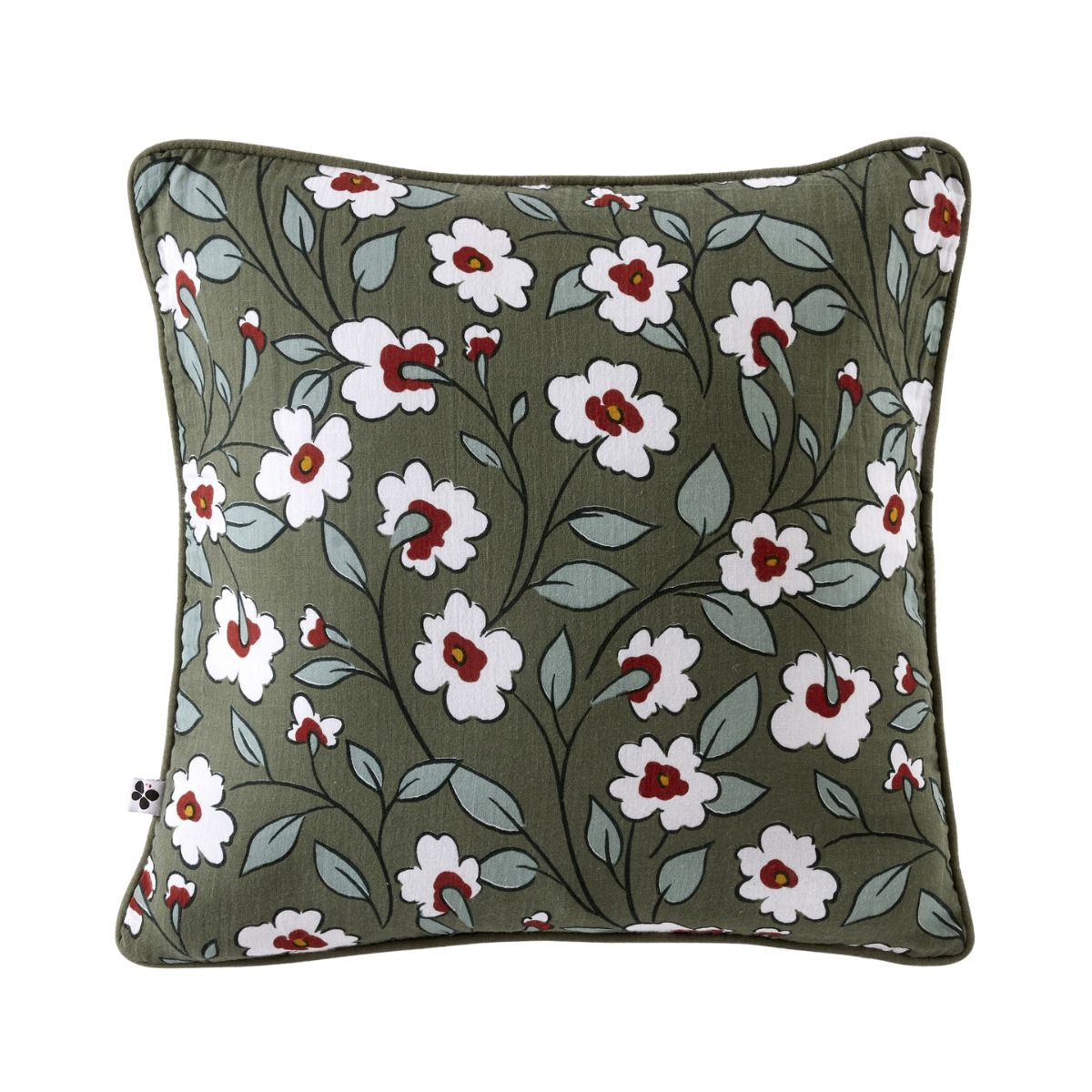 Le coussin FLORA de L'Effet Papillon apporte au canapé et au lit toute la richesse botanique d'un imprimé d'inspiration indienne — grandes fleurs blanches sur fond vert kaki profond, en double gaze de coton douce et légère, garnissage inclus, prêt à poser. Un coussin qui change tout à l'ambiance d'un espace.