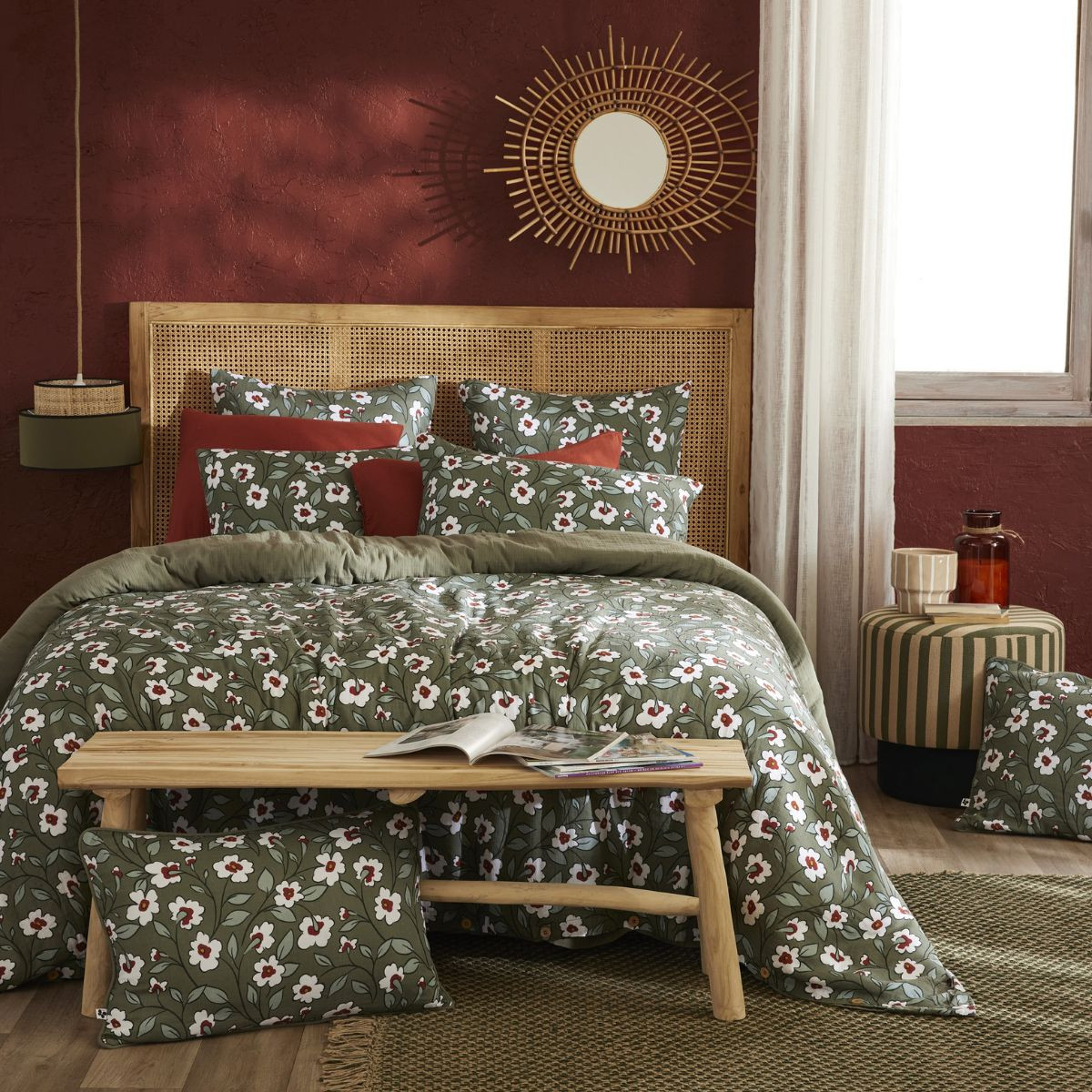 Édredon FLORA de L'Effet Papillon. Double gaze coton 100 %, 125 gr/m². 90 × 200 cm. Garnissage 300 gr/m². Botanique fleuri sur fond vert kaki. Le jardin au bout du lit.
