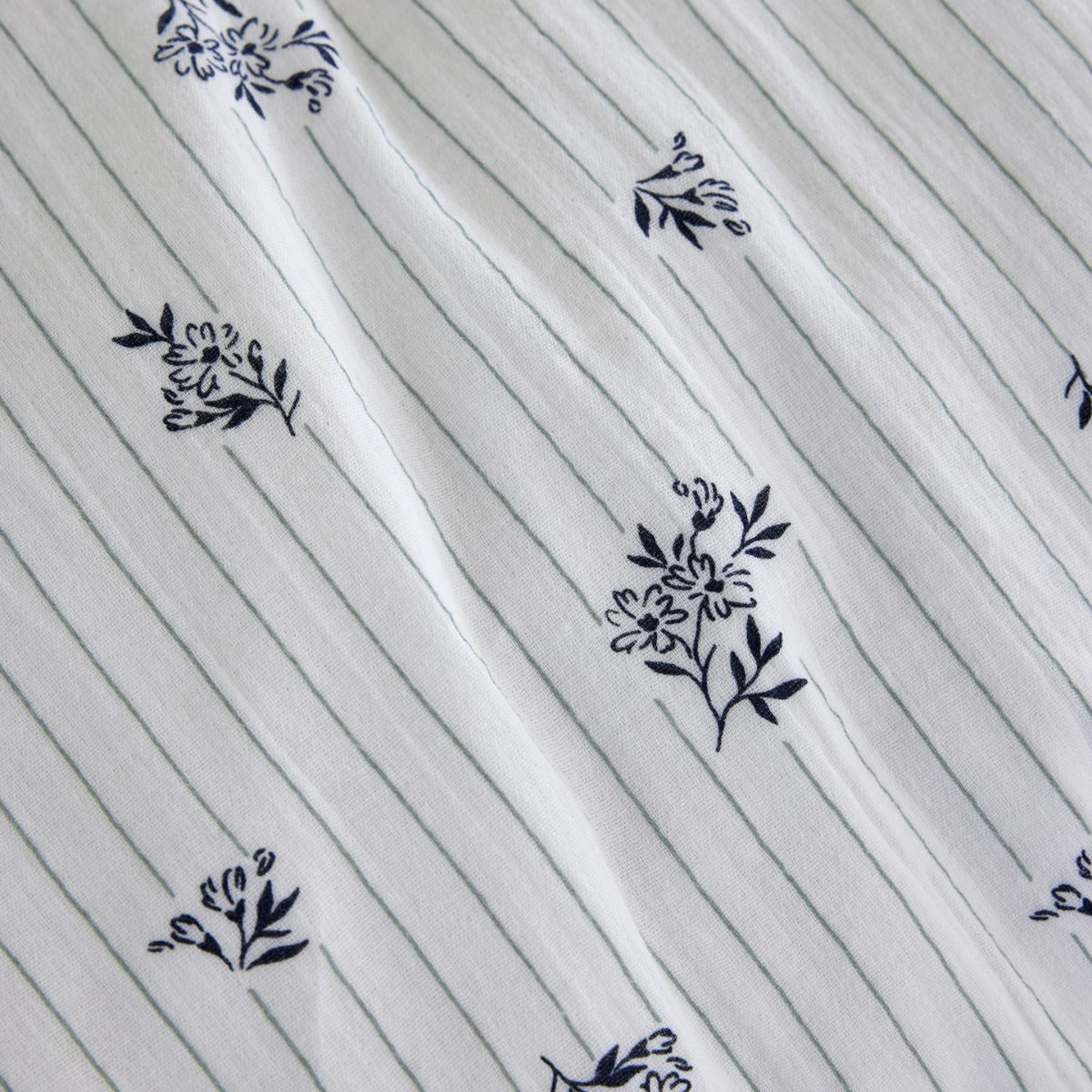 Recto, le motif discret et raffiné de la collection : petits bouquets floraux bleu marine épars sur fond blanc rayé, aéré et romantique.
