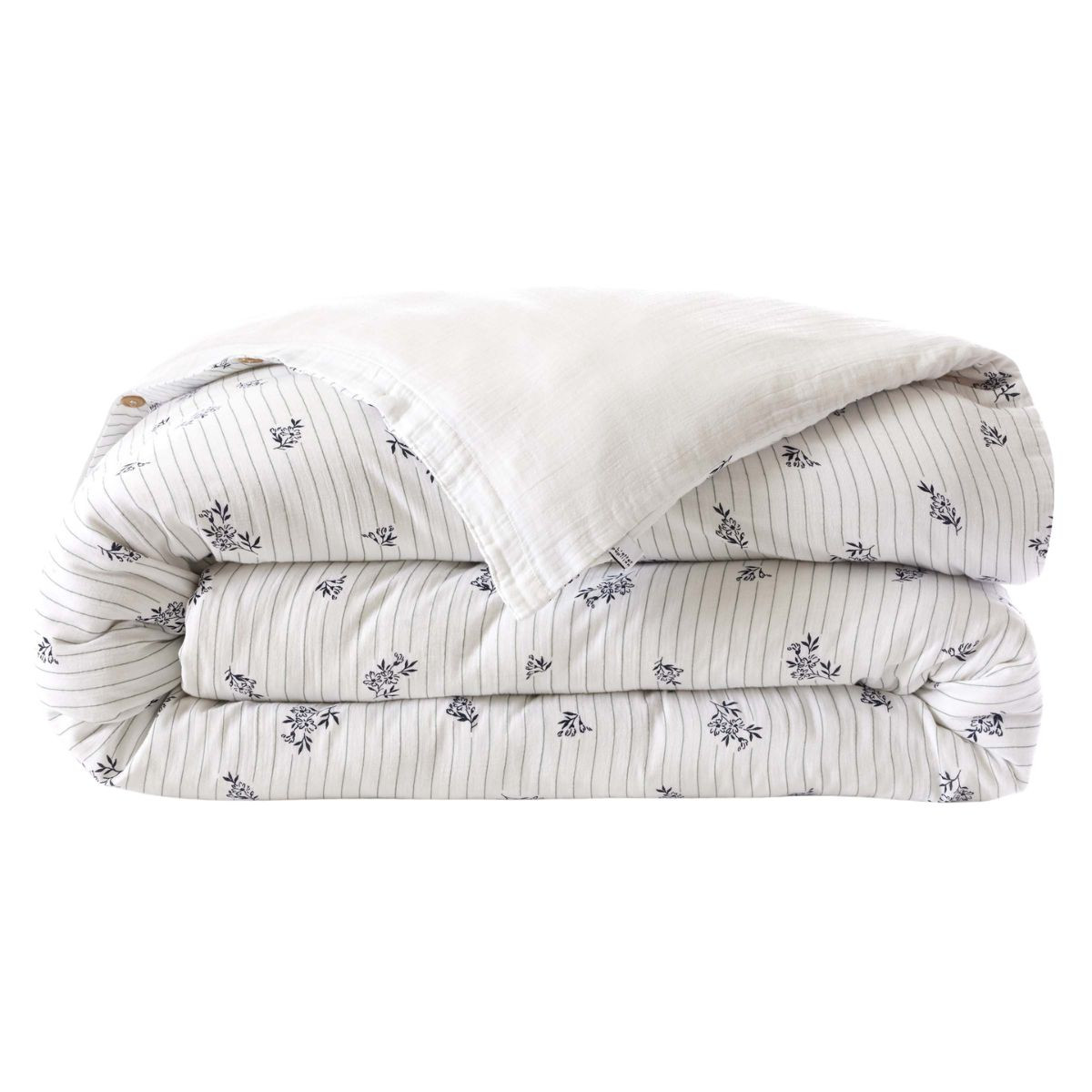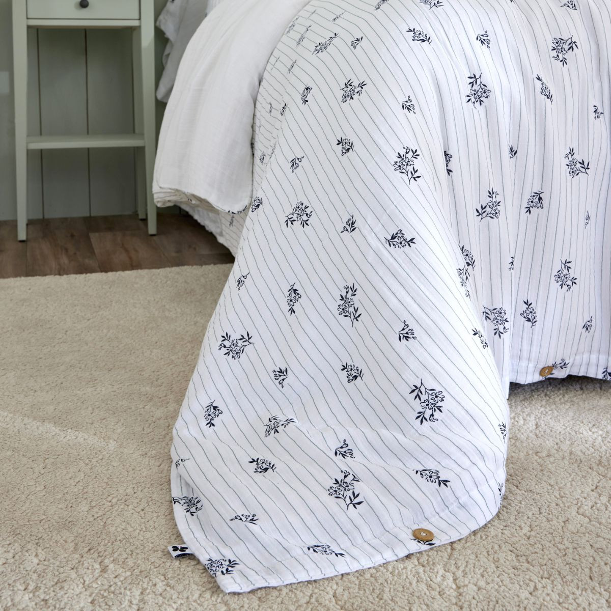 Sur la face imprimée d'ELÉONORE, laver à l'envers et avec essorage doux préserve la netteté du tracé des bouquets floraux et la vivacité du bleu marine dans la durée. Sur la face unie Chantilly, le lavage à 40°C standard est suffisant. Les deux faces étant en double gaze 100 % coton, elles partagent les mêmes consignes globales — la spécificité de la face imprimée justifie la précaution de l'essorage doux pour l'ensemble de la housse.