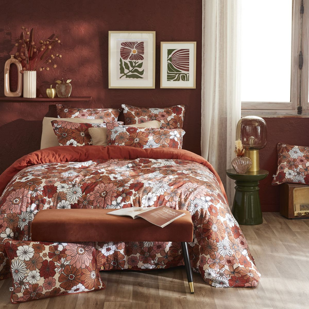 ANNA est une taie qui s'assume seule — posée sur un lit en lin naturel ou en coton lavé uni, elle n'a pas besoin d'être accompagnée d'autres pièces imprimées pour exister. Si l'on souhaite enrichir la composition, les teintes à retenir sont le terracotta, le bordeaux et le rose poudré du motif, déclinées en coussins unis. L'association avec un linge de lit crème ou ivoire renforce la cohérence du fond et laisse les fleurs s'exprimer sans concurrence.