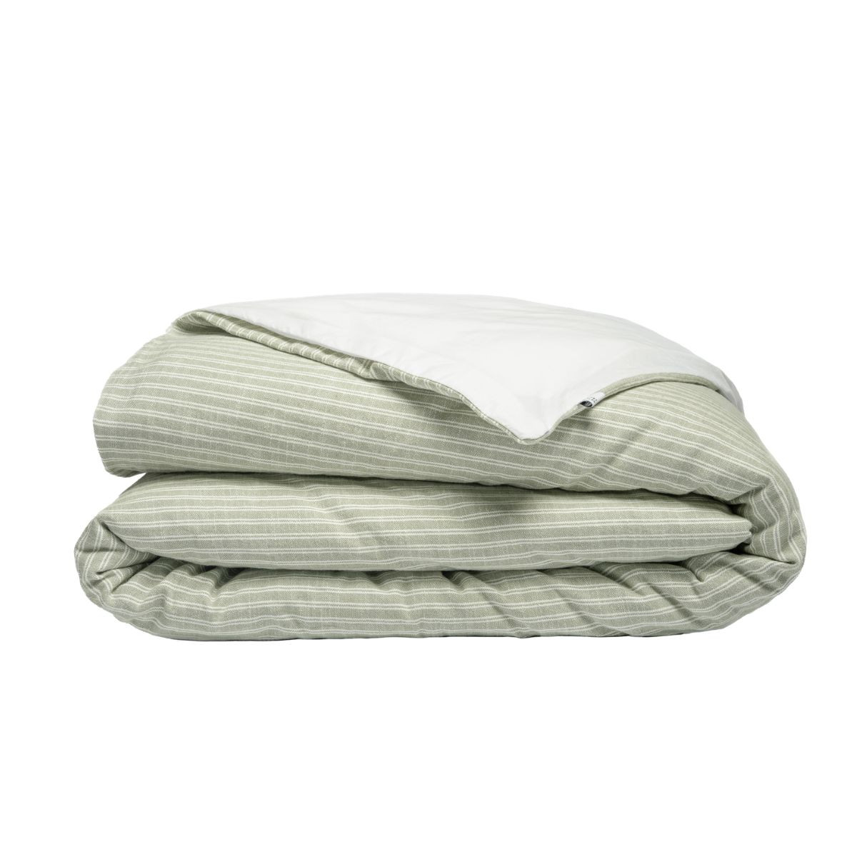 Laissez-vous séduire par le contraste assumé de cette housse de couette : une face avant en coton texturé vert et écru aux rayures horizontales tissées dans la masse, dense et mate, qui donne au lit une présence immédiate — et un dos en percale lavée blanche, souple et douce, qui allège l'ensemble et invite au repos. Deux matières, deux caractères, une seule pièce pensée pour habiller le lit avec cohérence et naturel.
